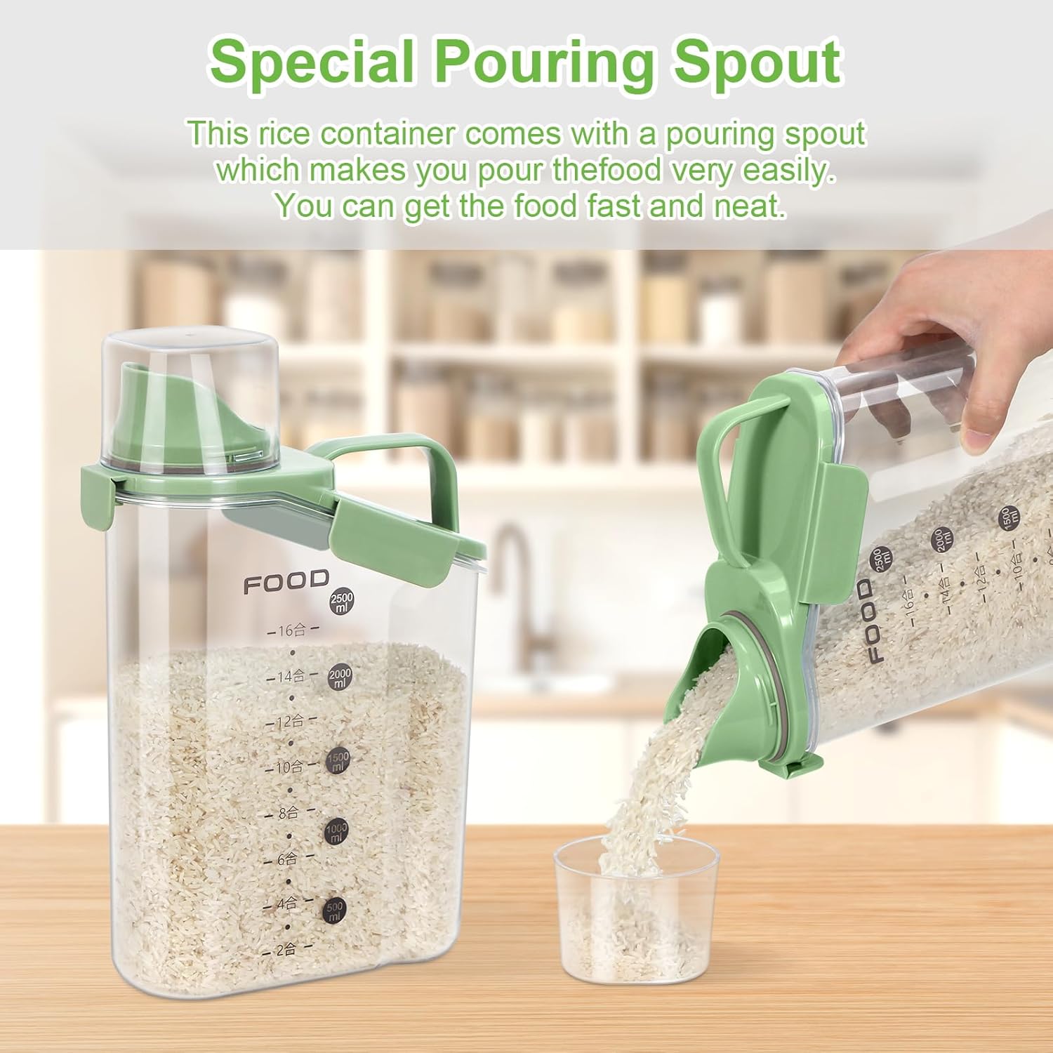 - UPGRADED EASY-POUR LARGE SPOUT: This rice Bin features a large pouring spout to easily dispense your ingredients. Its ergonomic design provides a comfortable grip for easy one-handed pouring.rice storage containers Slim compact and space-saving