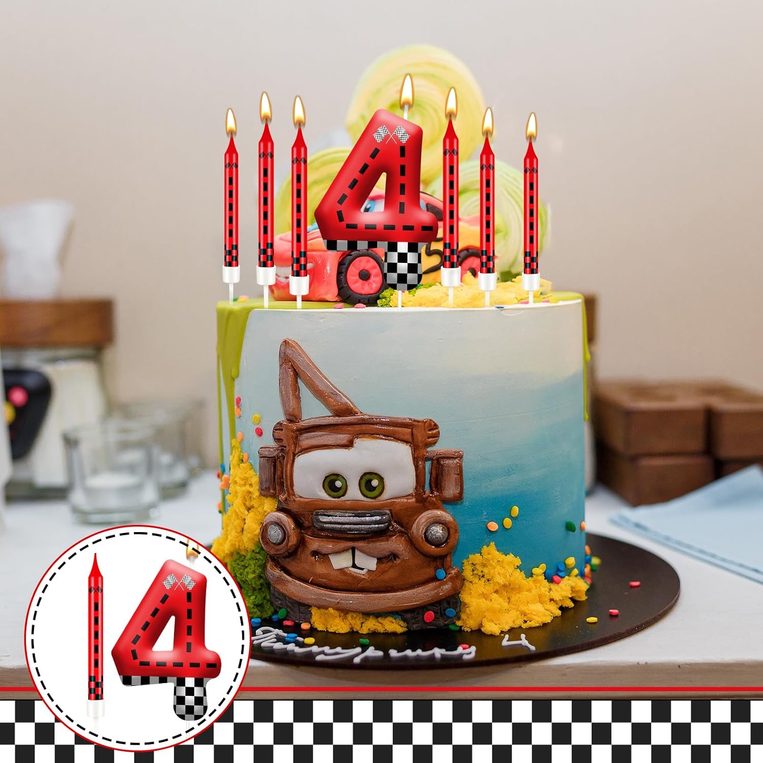 13PCS Racing Car Theme Birthday Candle Set with Checkered Flag Design - Durable Cake Topper for Race Car Party Decorations, Kids Birthday Supplies - Number 4 Candle for Racing-Themed Celebrations