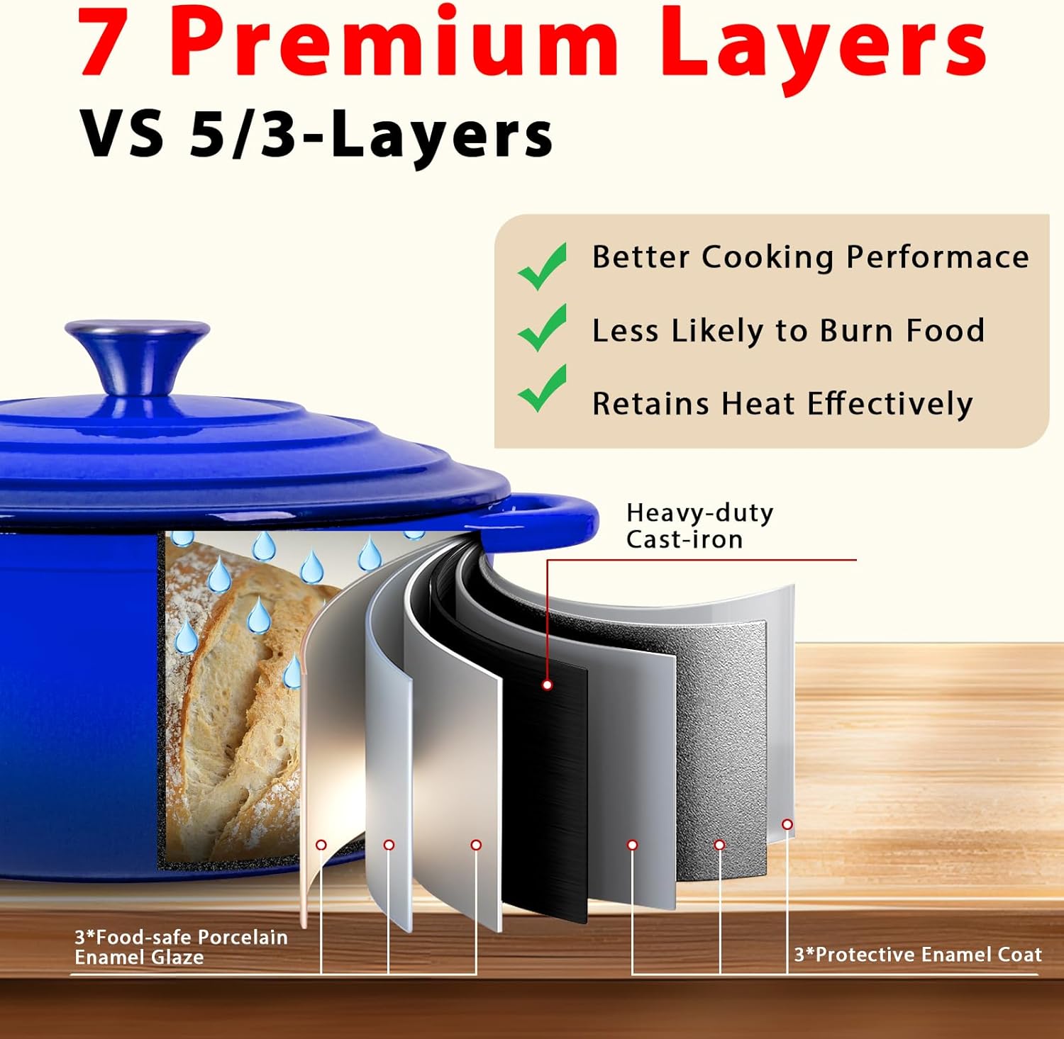 - 7-Layer Superior Construction: Triple-enamel coating + 4-layer cast iron core ensures unparalleled heat retention (30% better than standard Dutch ovens) and chip-resistant durability