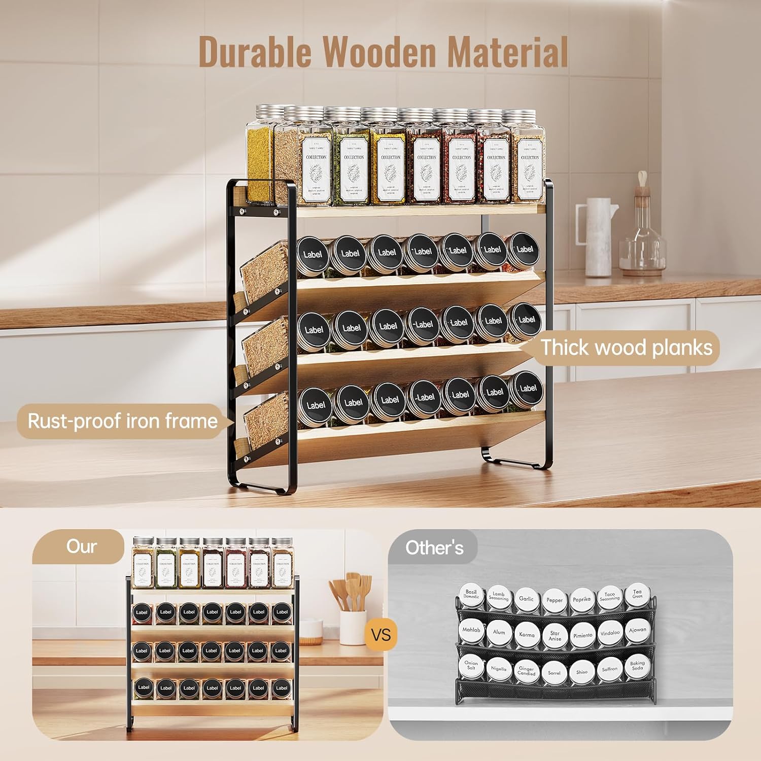 - Rugged Metal & Wood Frame: We mixed a tough metal frame with real wood shelves because they just last. It's naturally rust-proof, handles kitchen humidity, and those solid wood shelves won't warp or sag, even when fully loaded, because each tier can hold up to 4.4 pounds