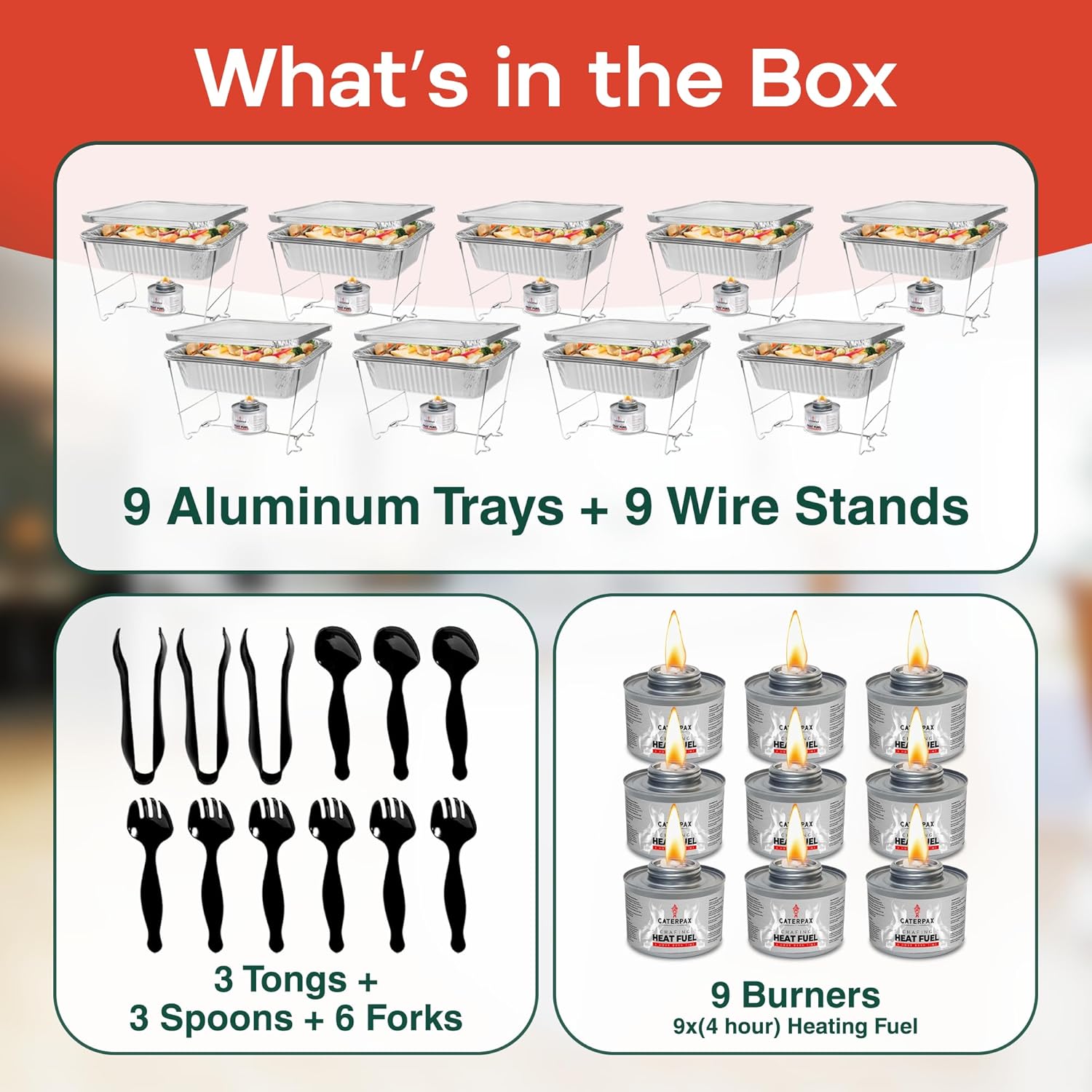 9 Pack - Disposable Chafing Dish Buffet Set (57 PCS) – Catering Food Warmers with 9 x Half Size Aluminum Pans, Foil Lids, Foldable Racks, Utensils & Fuel Cans - Perfect for Parties, Weddings & Events