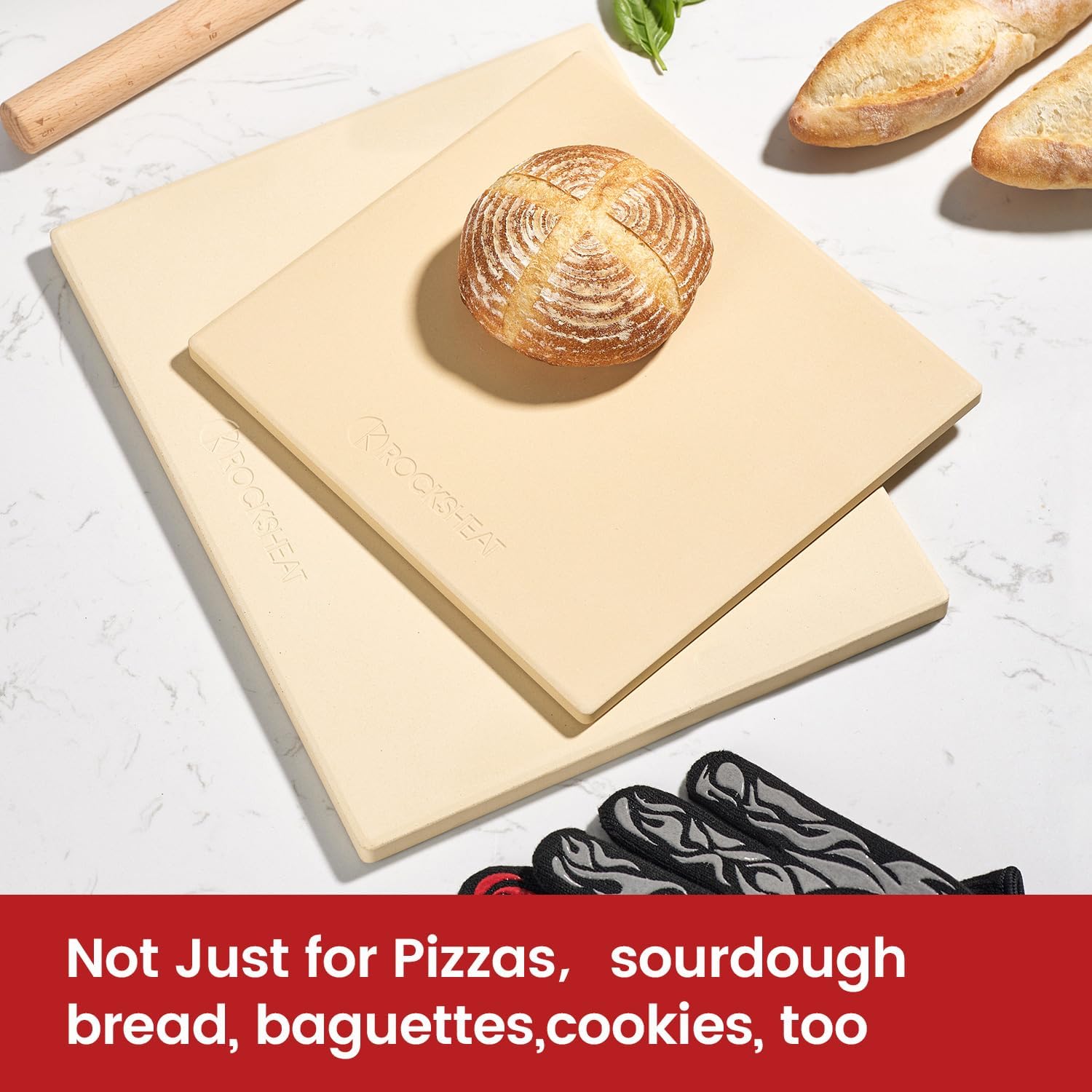 - ROCKSHEAT Rectangular 20" × 13.5” × 0.6" Pizza Stone, a versatile addition suitable for ovens, grills, and BBQs. Its generous size is perfect for 12-inch pizzas and a variety of other baked goods, making it an essential for home use and entertaining at pizza parties.