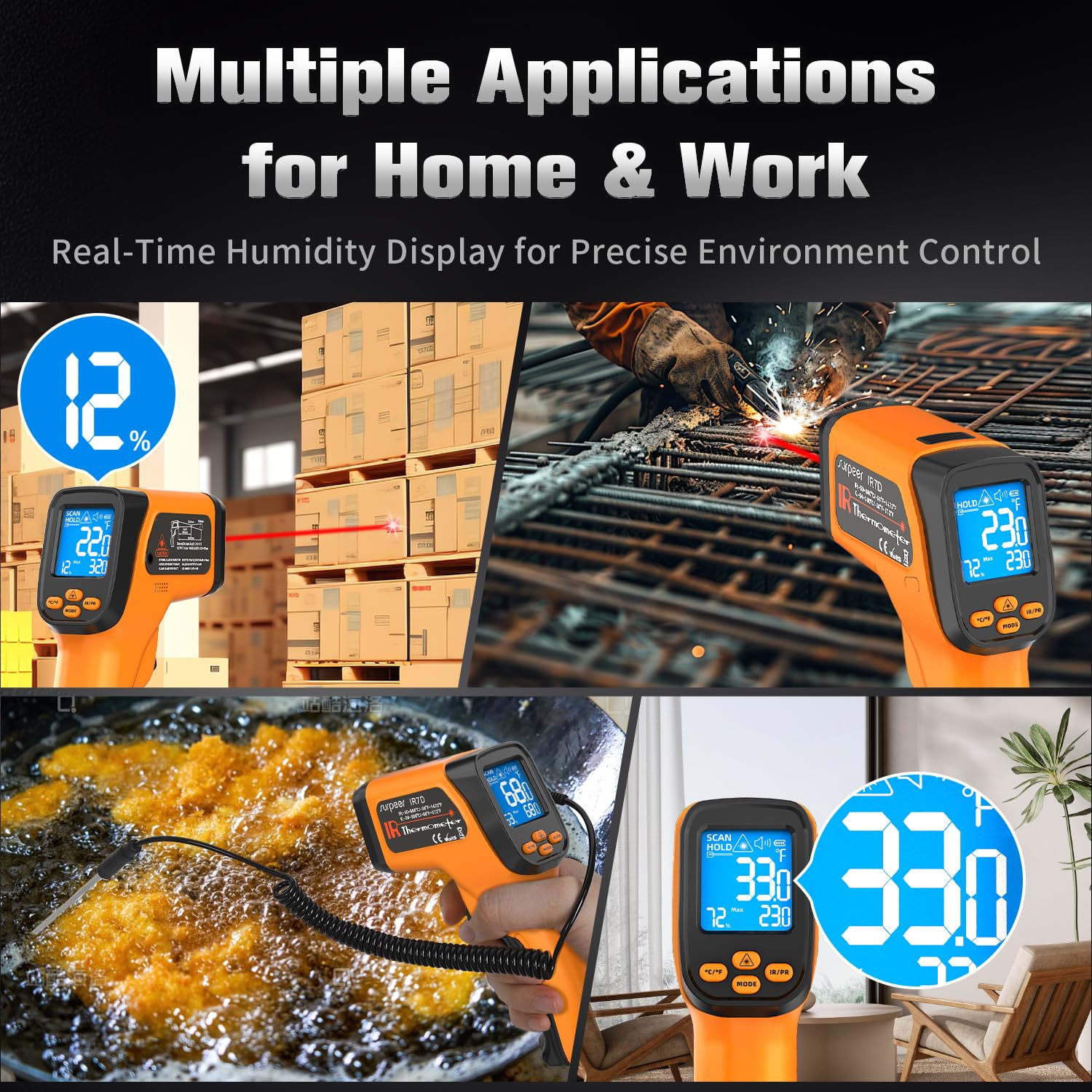 - Special Feature : 12:1 distance-to-spot ratio, K‑type probe, Low Battery Indicator, Real-Time Humidity Display