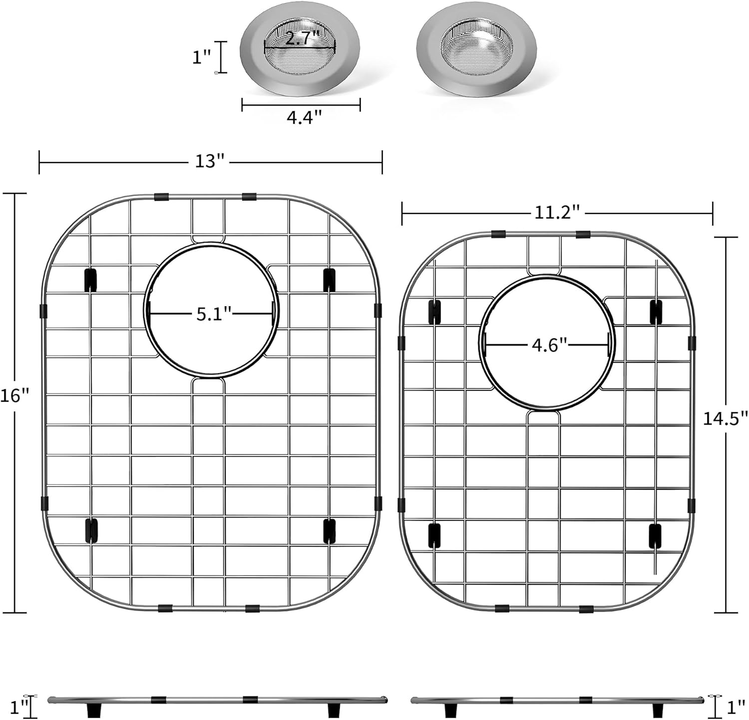 - Dimension: The size of sink protectors for kitchen sink is 16’’L x 13’’W and 14.5"L x 11.2"W, with a 5.1’’ and 4.6" diameter at the bottom rear drain corner of the sink, and a 4.4" diameter sink filter. Before purchasing, please make sure that the size of your sink is suitable for use. Please pay attention to the size of the sink and the location of the drain.