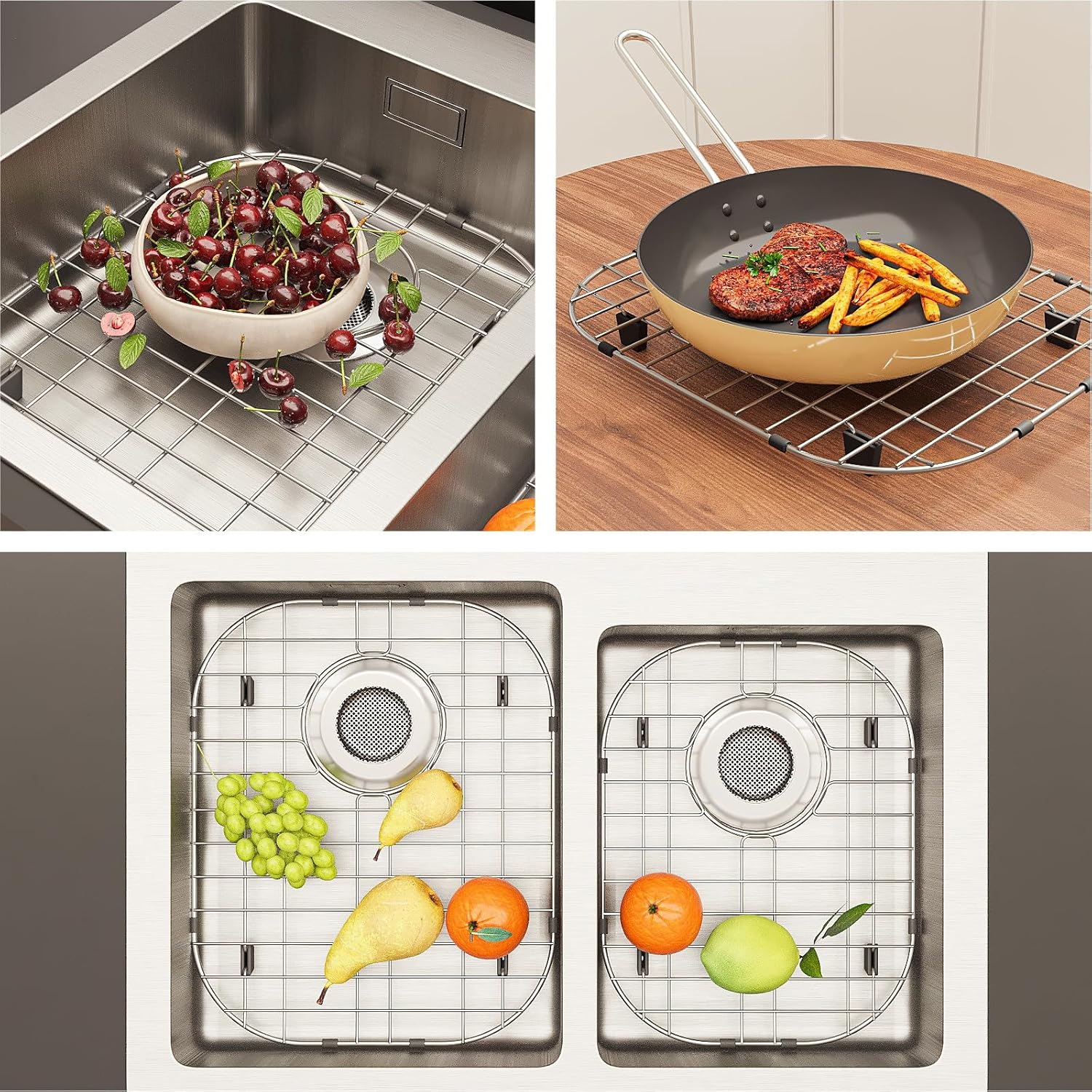 - Perfect Workmanship for Kitchen Sink Protectors: The surface of this stainless steel kitchen sink protector is polished by grinding and polishing, the surface presents a smooth finish, there will be no excess welding residue that will scratch your skin. The sink rack for bottom of sink are widely used. You can use it as a drain rack, dish draining rack, drying rack, cooling rack, defrosting rack, etc.