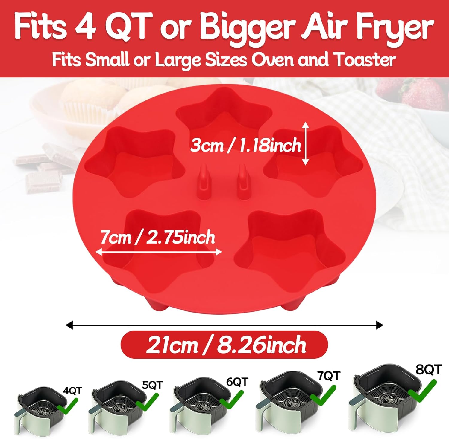 - Air Fryer Egg Bites Muffin Pan Cups Silicone Mold:You will get 1 pcs star shape egg bites molds,Our air fryer muffin pan is 8.26 x 8.26 inches and each cup is 2.75 inch in diameter,cup depth: 1.18 inch,This size design makes the suitable for smallest air fryer 4QT perfectly match,fits 4 QT or bigger air fryer ,These egg bite maker are engineered for convenience and are compatible with a wide range of air fryers and ovens,the 5 cup design per pan of silicone egg bite molds ensures consistent,evenly baked results every time.