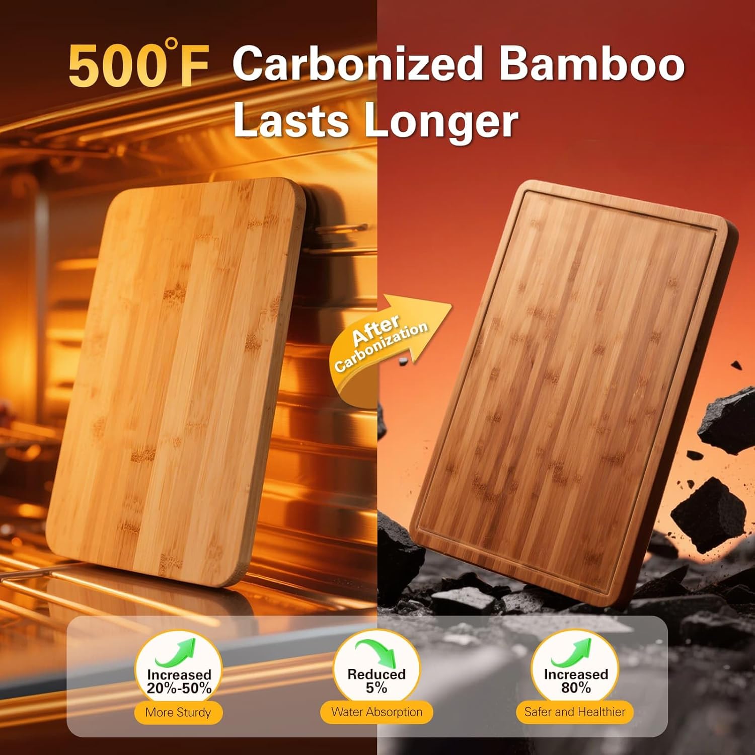 - Special Feature : 500°F Carbonized Cutting Boards, Build-in Groove, Built-in Handle, Lightweight