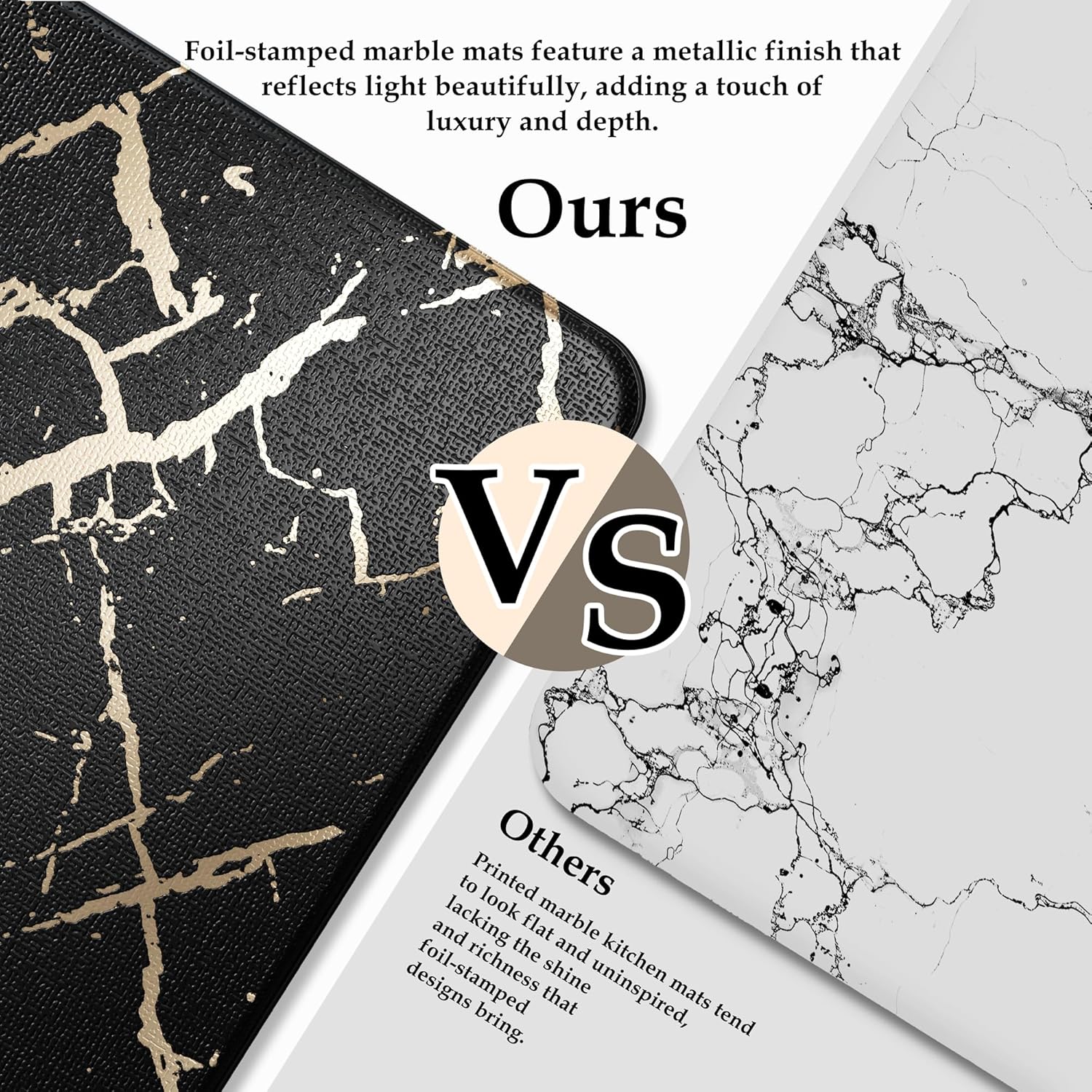 Gold Foil Stamped Marble Kitchen Mats for Floor 2PCS Cushioned Anti Fatigue Non Slip Waterproof Comfort Leather Kitchen Rugs 2/5 Inch PVC Kitchen Mats for Sink, Laundry, 17.3"x28"+17.3"x47", Black