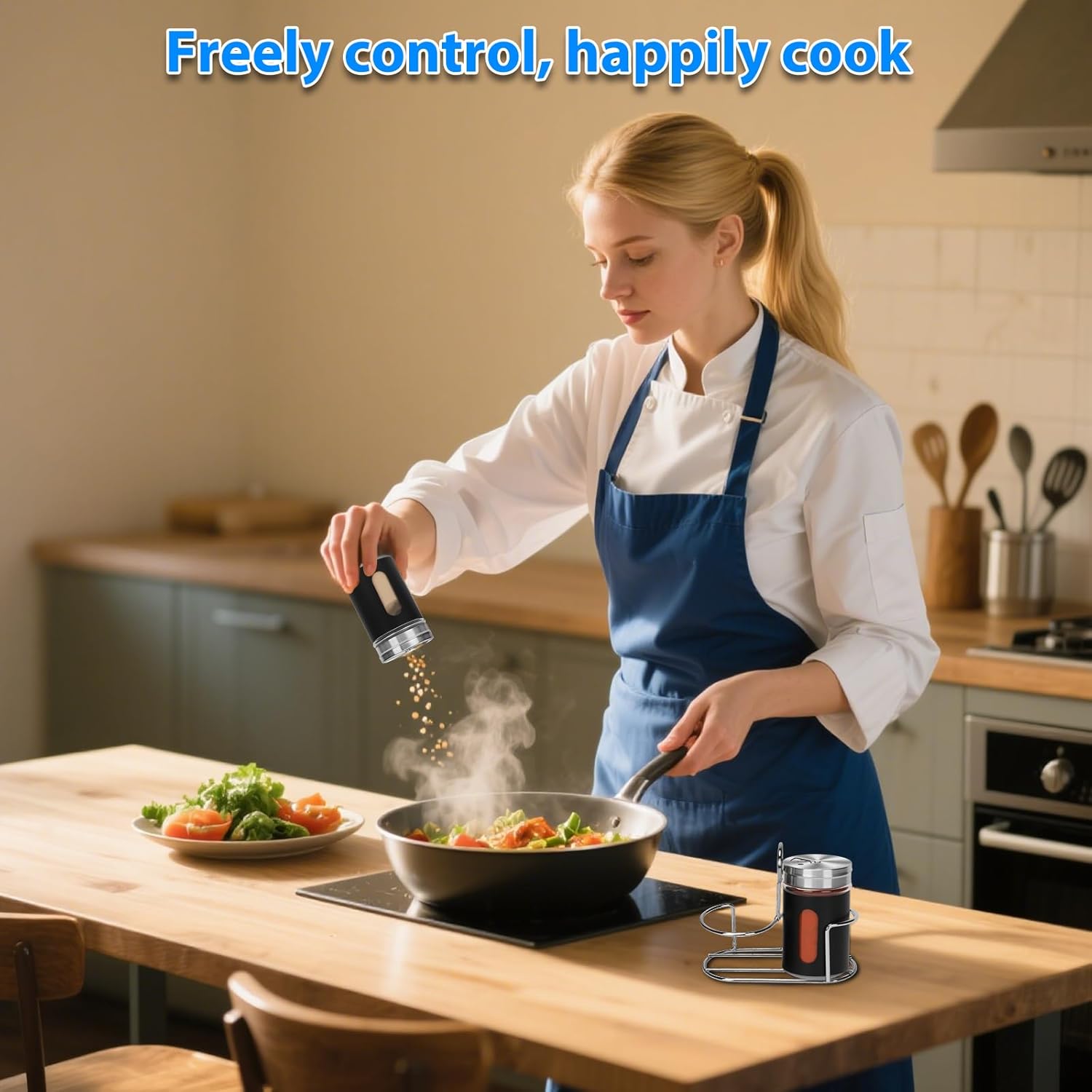 - Salt and pepper seasoning set with two seasoning jars, a seasoning jar rack, you can store a variety of seasonings, three sizes of connecting holes