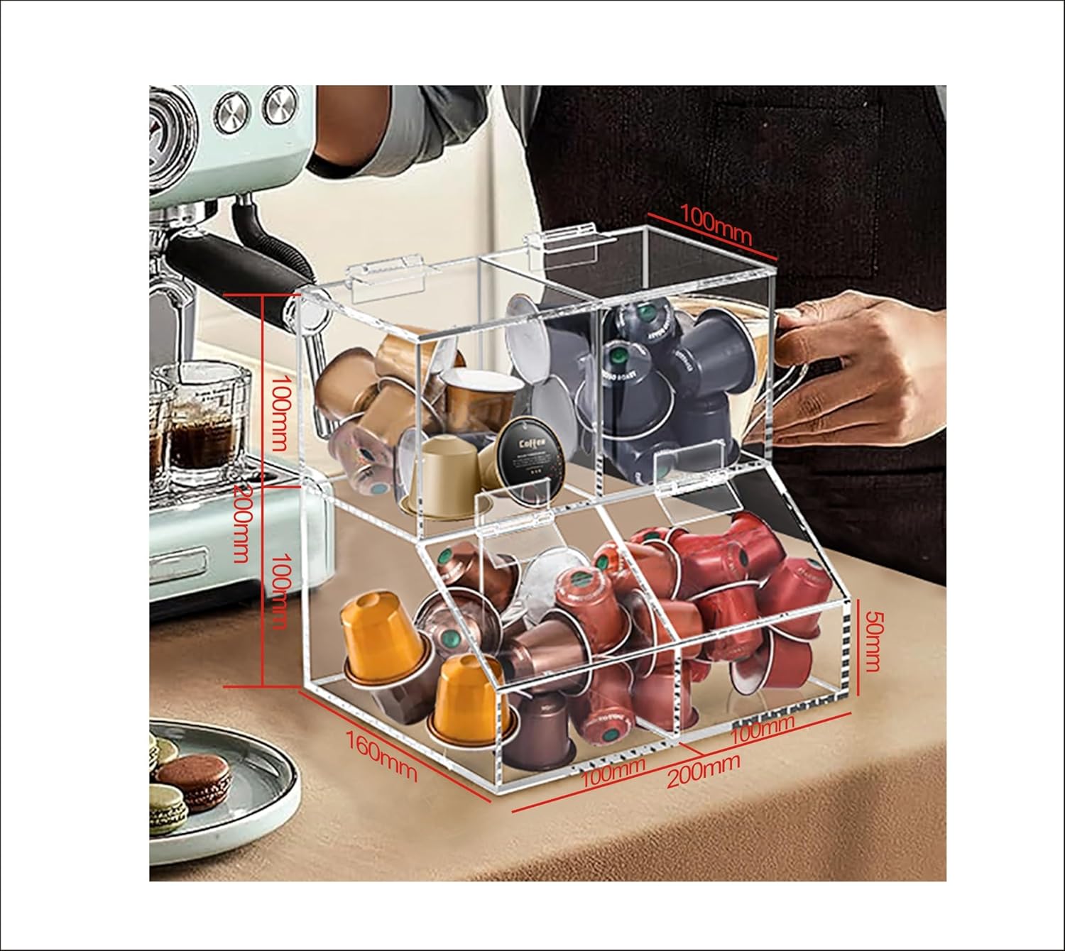 - Overall Measuring 7.8" H x 7.8" W x 6.3" D inch,made of clear acrylic, with lid opens to load of coffee pod easily.