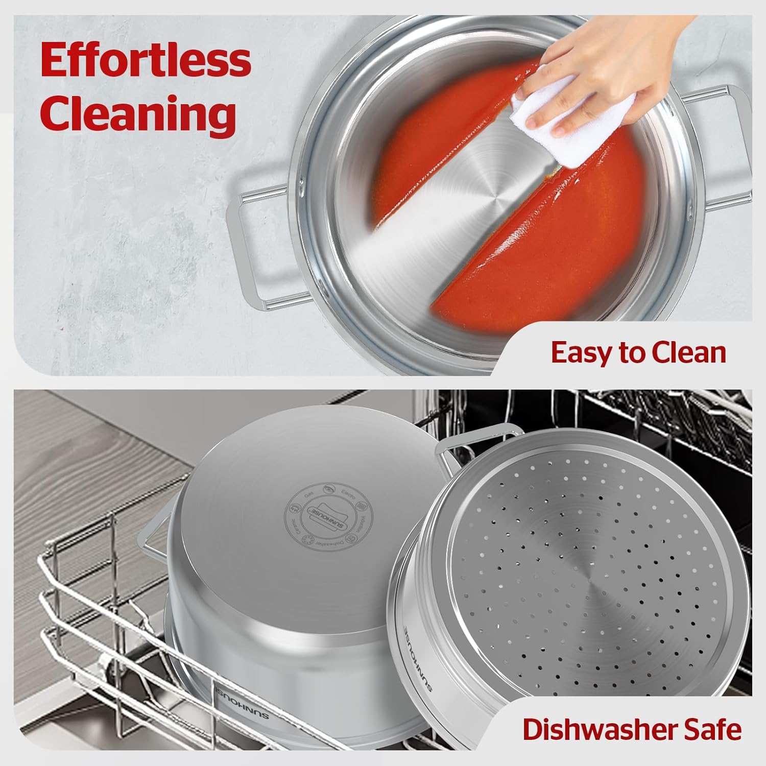 - Healthy Cooking Made Easy - Sunhouse's 5.5 QT Steamer & 3.8 QT Stockpot which made of premium material is non-toxic and food-grade for better health, nutrition, and cooking. The high-quality stainless-steel cooking surface won't react with food or alter natural flavours for consistent cooking results