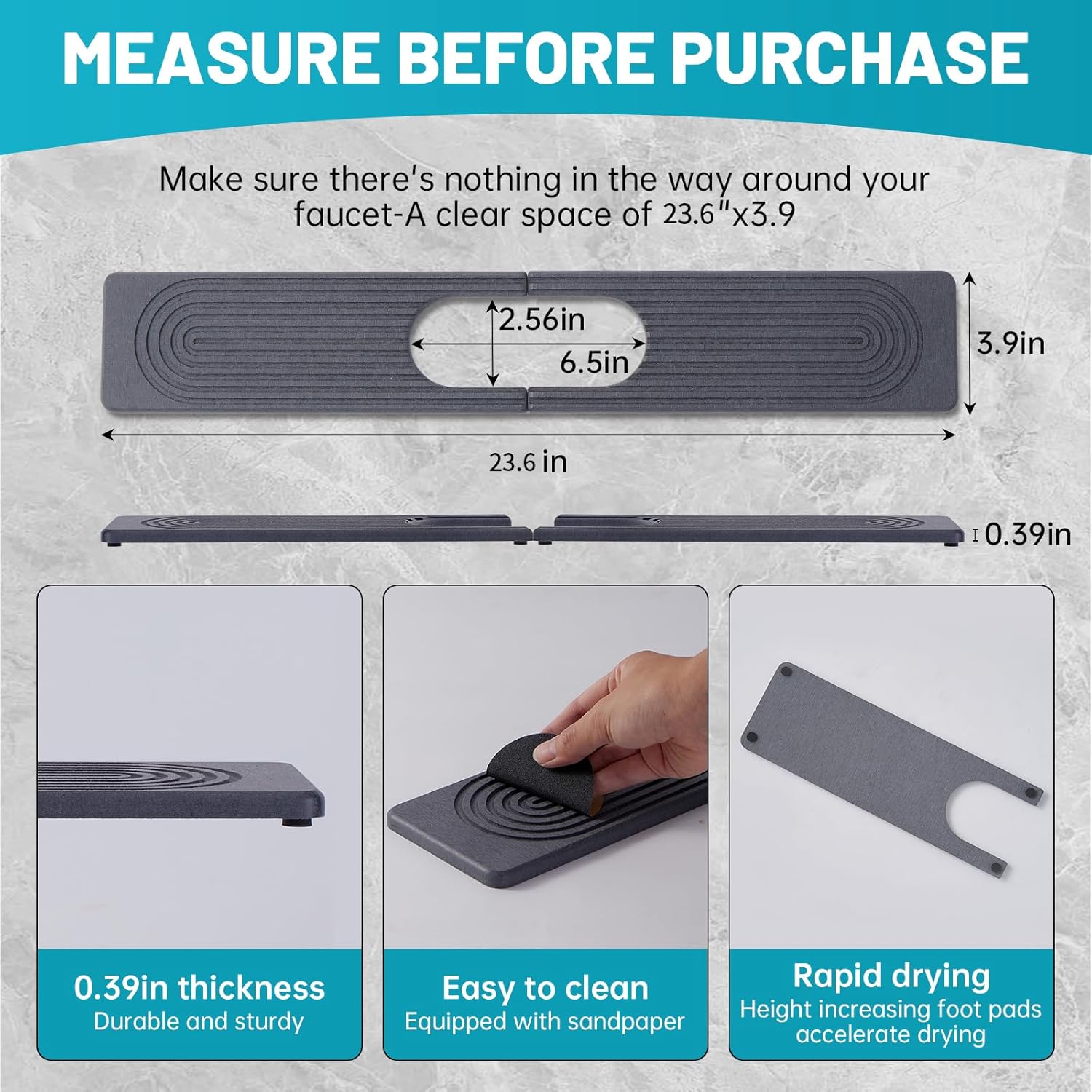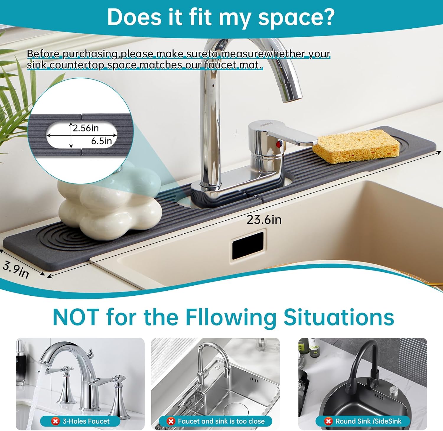 - Please Measure Before Purchasing – This mat measures 23.6" × 3.9" × 0.35" with an oval hole about 6.5" × 2.5". Make sure it fits your faucet base and does not cover any sink buttons or soap dispensers. If your faucet area is smaller than these dimensions, this mat may not be suitable.