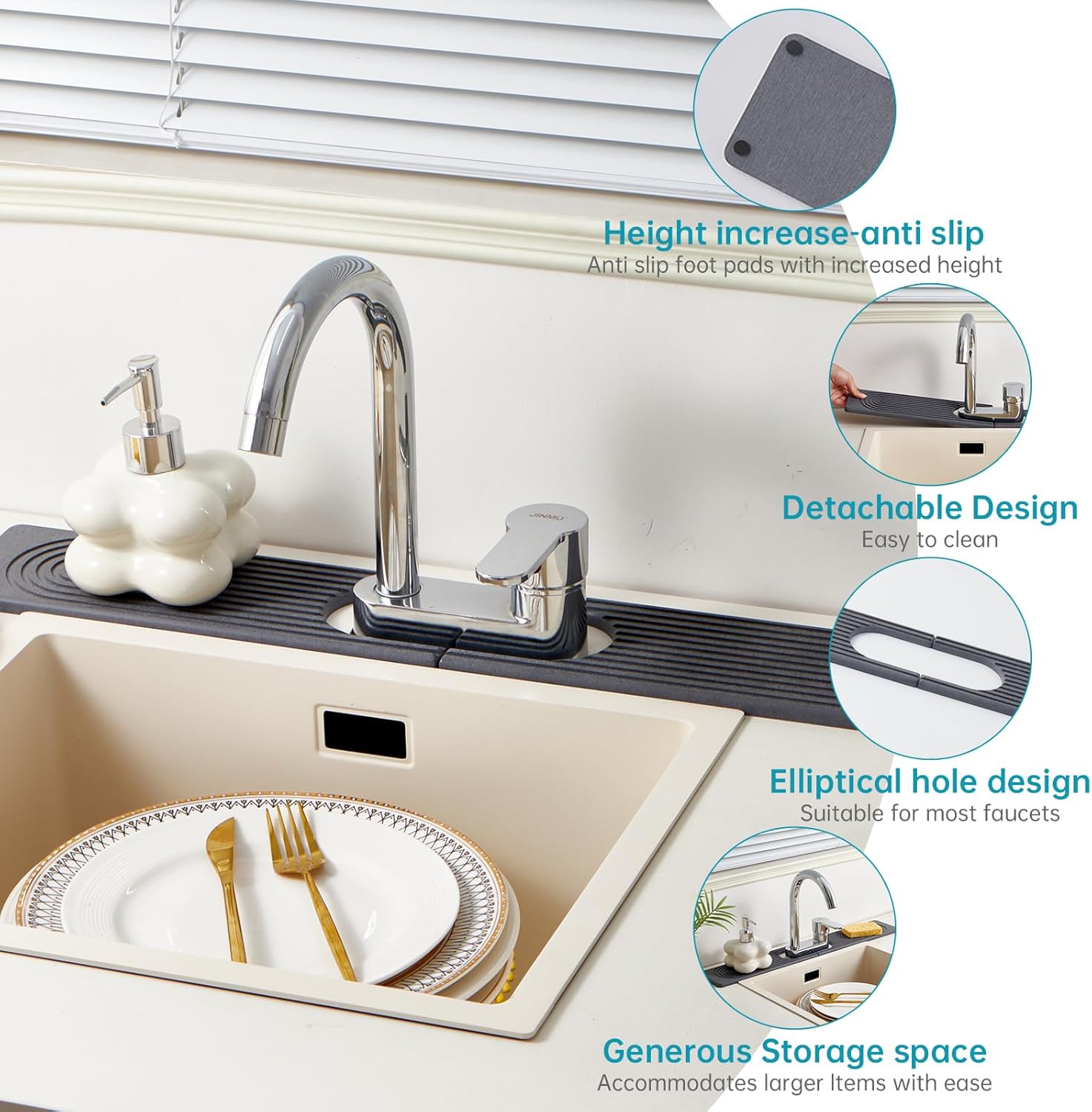 - Neat countertop: This versatile faucet mat is perfect for both your kitchen and bathroom. In the kitchen, it provides a convenient spot for your dishwashing sponges, soap, and small accessories. In the bathroom, it can hold toothbrushes, hand sanitizer, cups, and other essentials, helping you maintain a neat and clutter-free space.