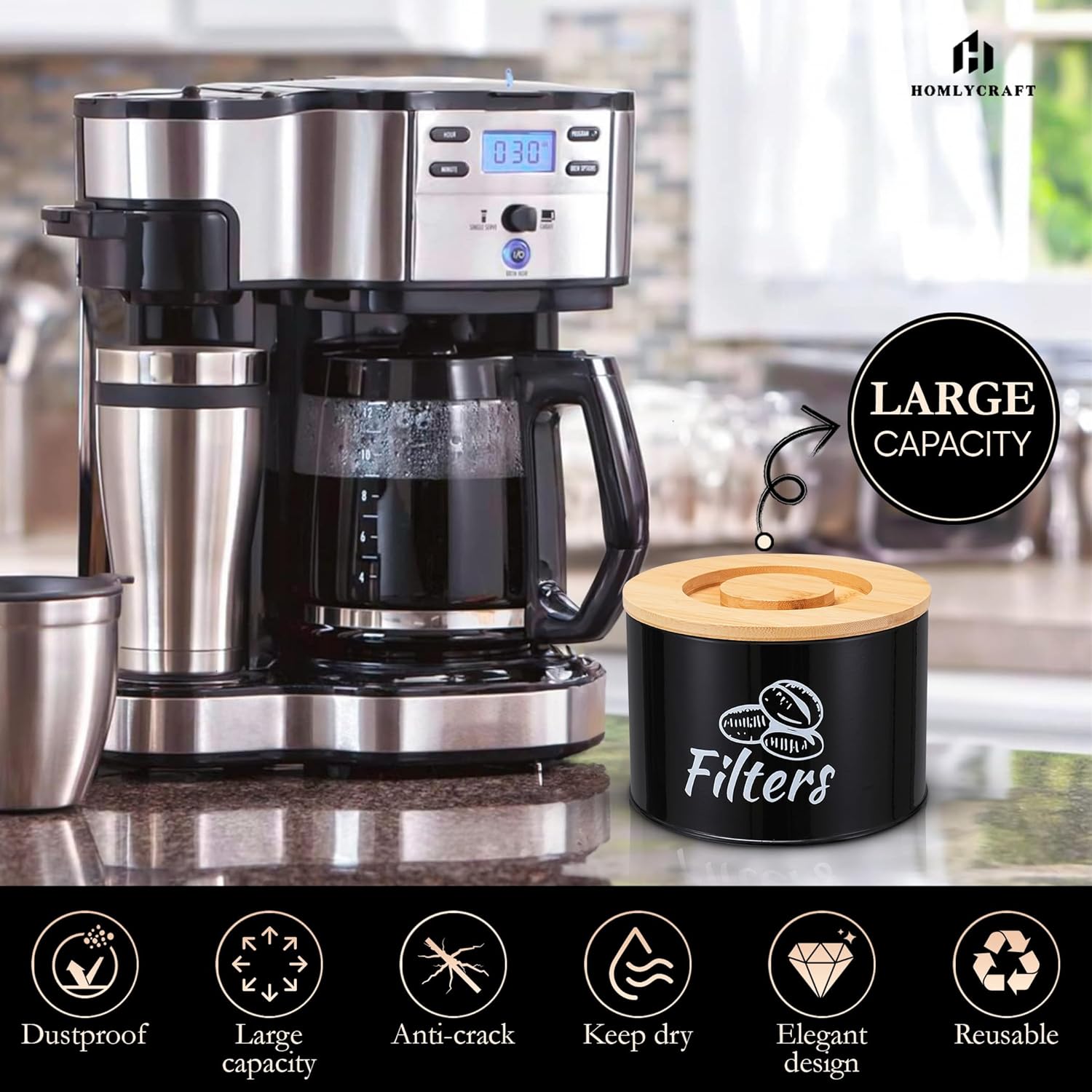 - ✅ Stylish Coffee Filter Holder Crafted from premium black metal, this container adds elegance and organization to your coffee bar. The warm bamboo lid provides natural contrast and a farmhouse-inspired touch.