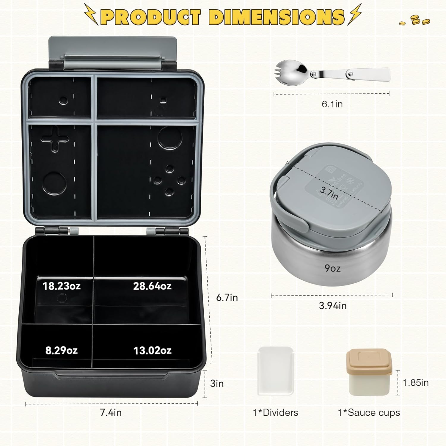 Game Bento Box for Kids, Lunch Box with Thermo(9oz Food Jar), Folding Spoon, Removable Divider & Sauce Cup, Lunch Box Kids for School,Travel, BPA-Free & Realistic Shape(Grey)