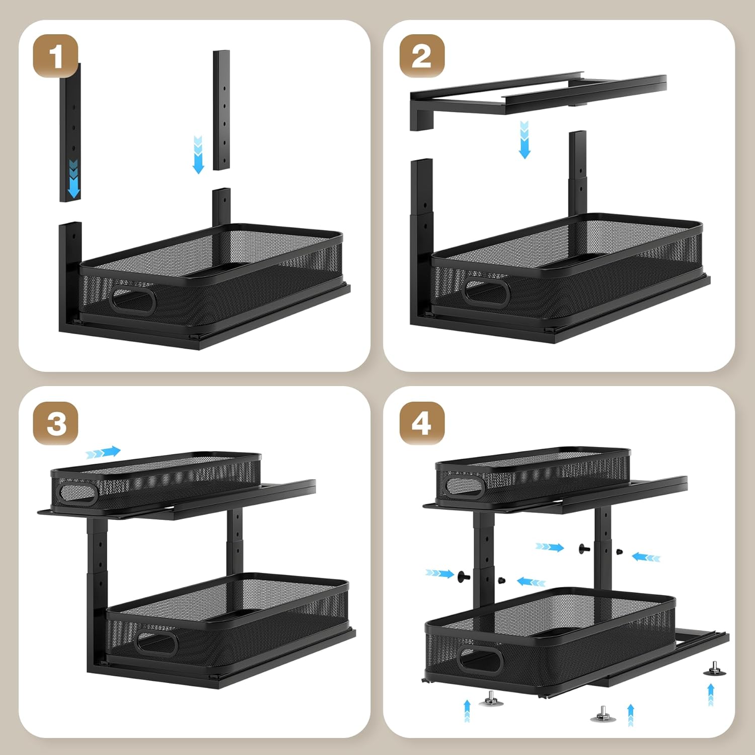 2 Pack 21IN-Depth Under Sink Organizer With Next-Gen Ball-Bearing Slides,2-Tier Precision Mesh Pull Out Cabinet Storage for Bathroom&Kitchen,Height Adjustable Drawers Shelf,Anti-rust-Black