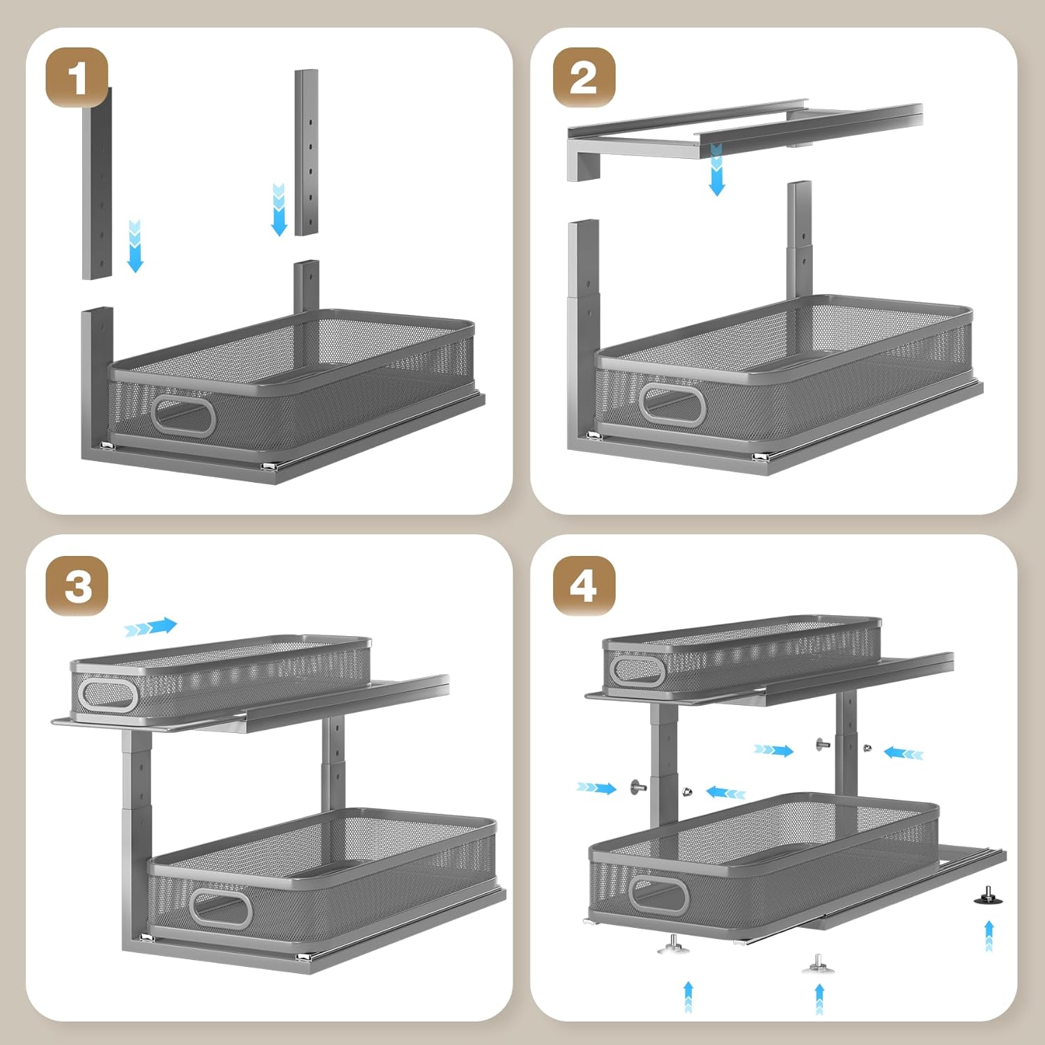 2 Pack 21IN-Depth Under Sink Organizer With Next-Gen Ball-Bearing Slides,2-Tier Precision Mesh Pull Out Cabinet Storage for Bathroom&Kitchen,Height Adjustable Drawers Shelf,Anti-rust-Grey
