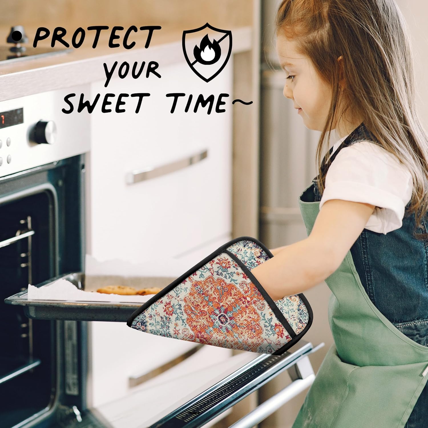 Rustic Vintage Boho Pot Holders for Kitchen, Abstract Orange Blue Boho Ethnic Floral Botanical Heat Resistant Hot Pads and Oven Mitts for Baking Cooking
