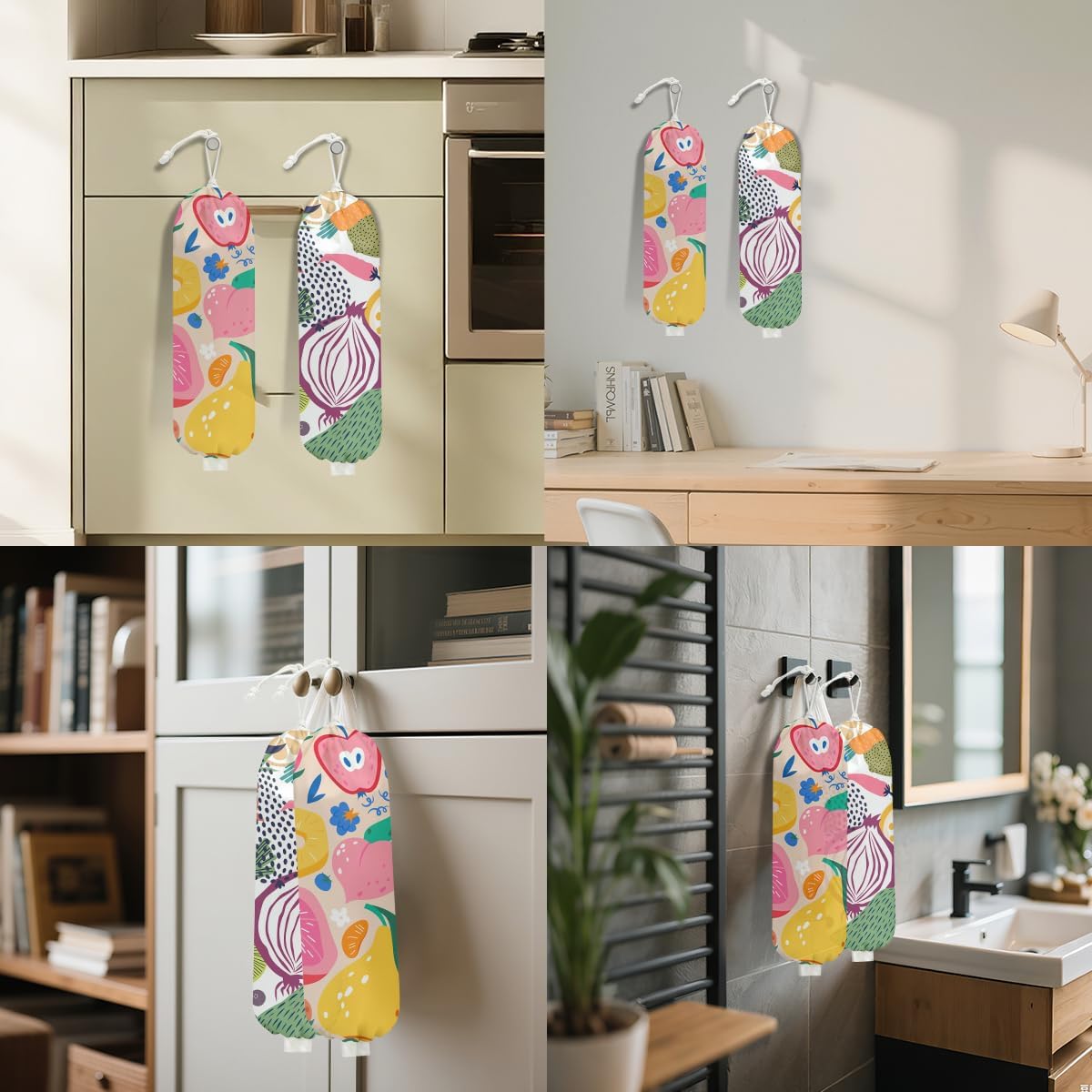 2Pcs Abstract Summer Fruits Plastic Bag Holder for Kitchen Essentials, Grocery Bag Holder for Plastic Bags, Dragon Fruit Orange Peach Reusable Grocery Bags Storage Dispenser for Home Kitchen Farmhouse