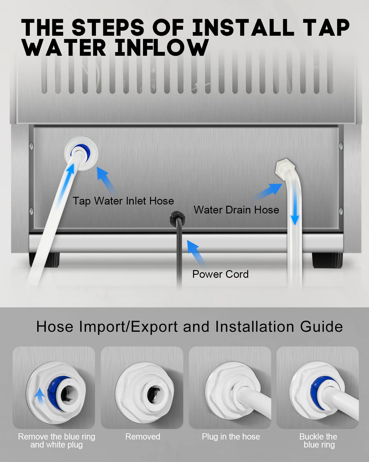 - 【Easy Installation & One-Touch Operation】Installation is simple with the included inlet hose, drain hose, and quick connectors—just hook up and start making ice automatically. Important Note: The stainless steel silver model is protected by a scratch-resistant film that appears white. You may peel it off or leave it on based on preference.
