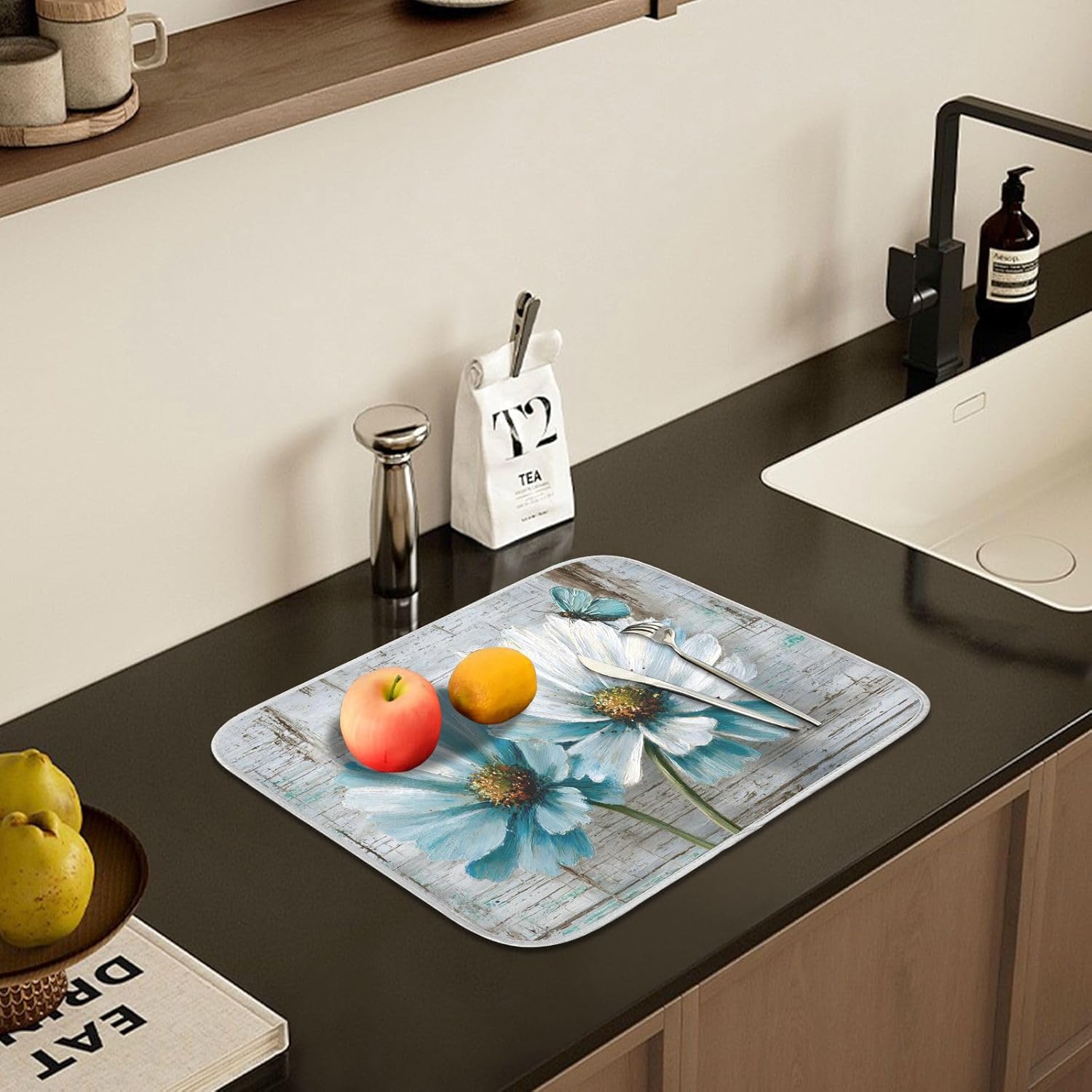 Rustic Teal White Daisy on Vintage Wooden Dish Drying Mat for Kitchen Counter Absorbent Microfiber Large Drying Pad Dish mats for Kitchen Countertops 18 x 24 Inch