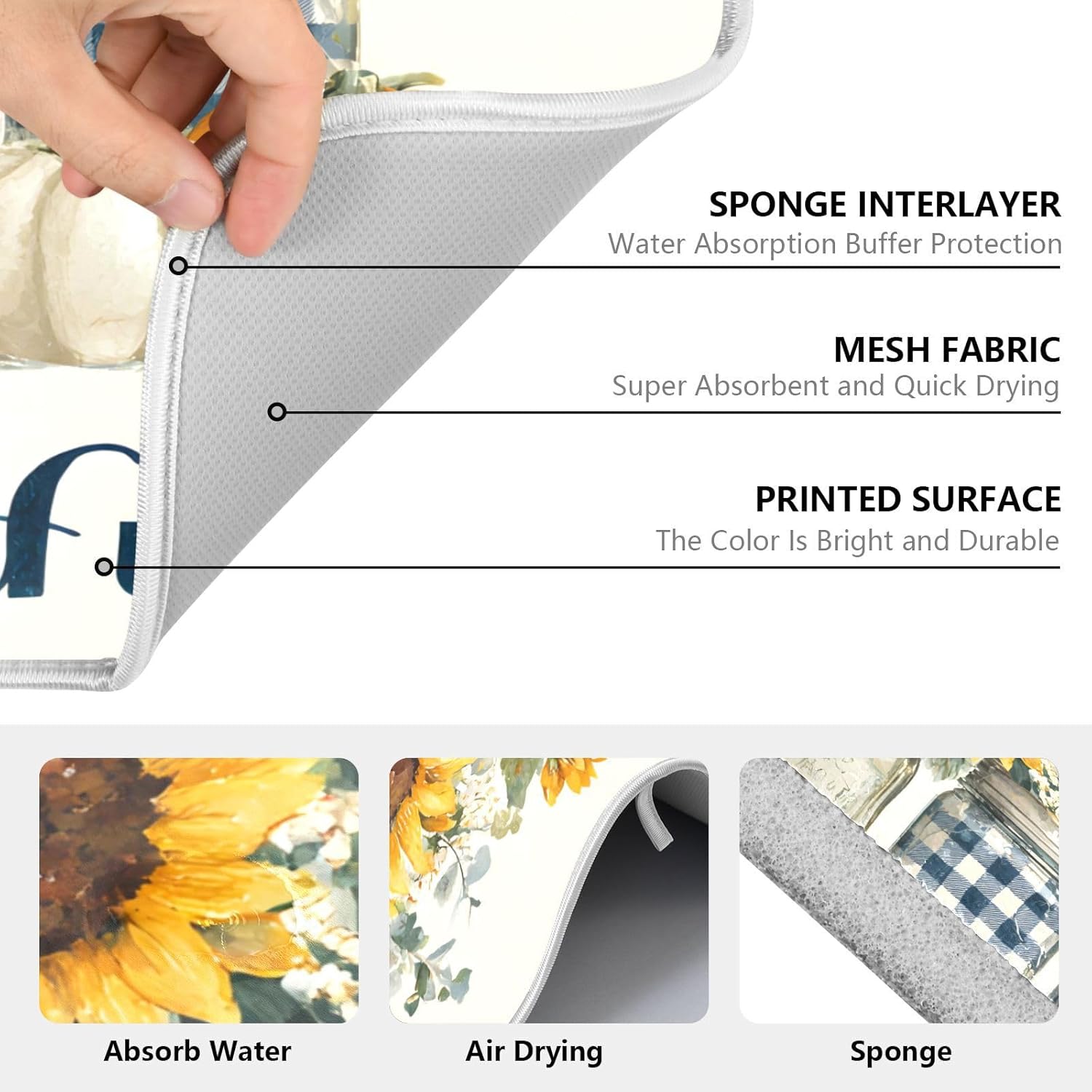- Quick Drying Mat: Both sides of the dish drying mat are crafted with absorbent microfiber, the middle composite sponge material, made from over 50% recycled fibers, it absorbs several times its weight in liquid, keep kitchen counter dry