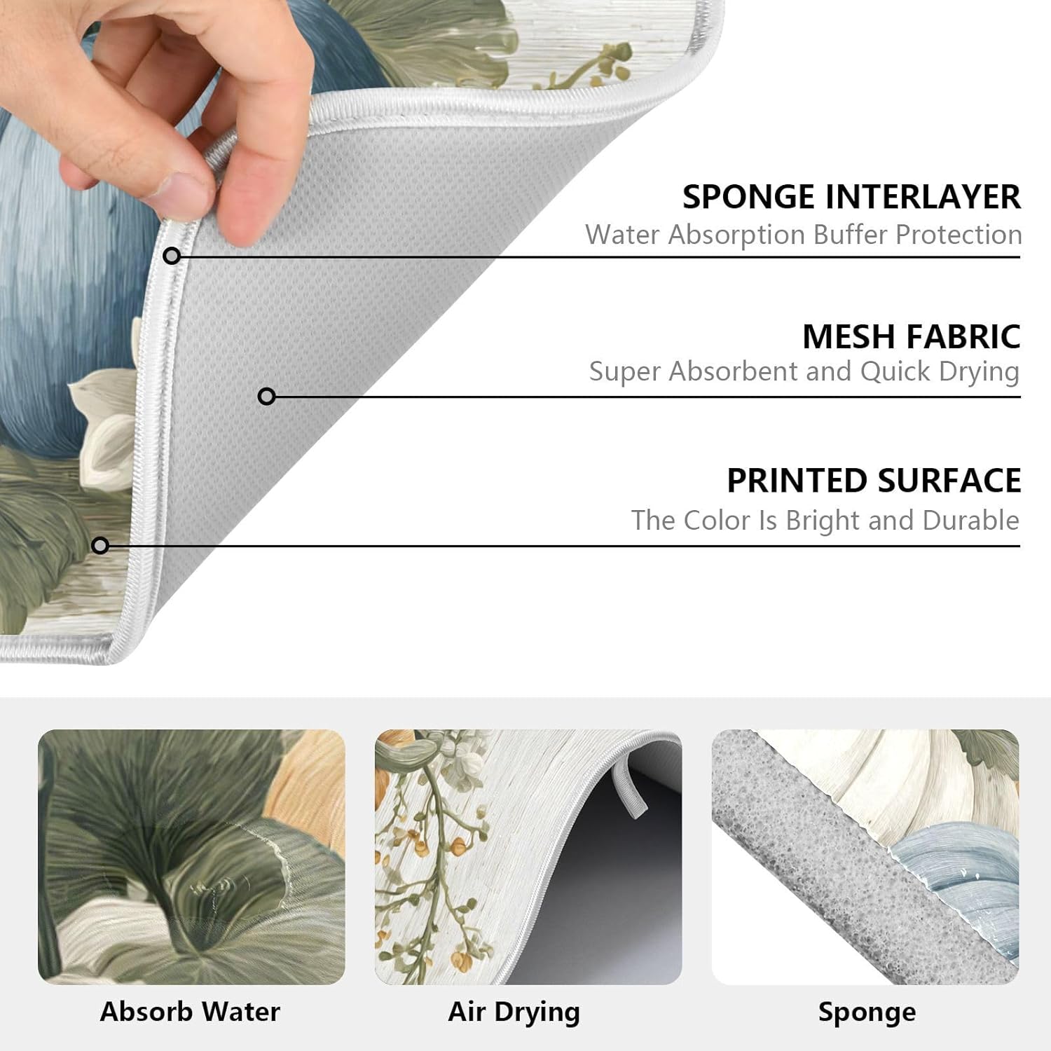 - Quick Drying Mat: Both sides of the dish drying mat are crafted with absorbent microfiber, the middle composite sponge material, made from over 50% recycled fibers, it absorbs several times its weight in liquid, keep kitchen counter dry