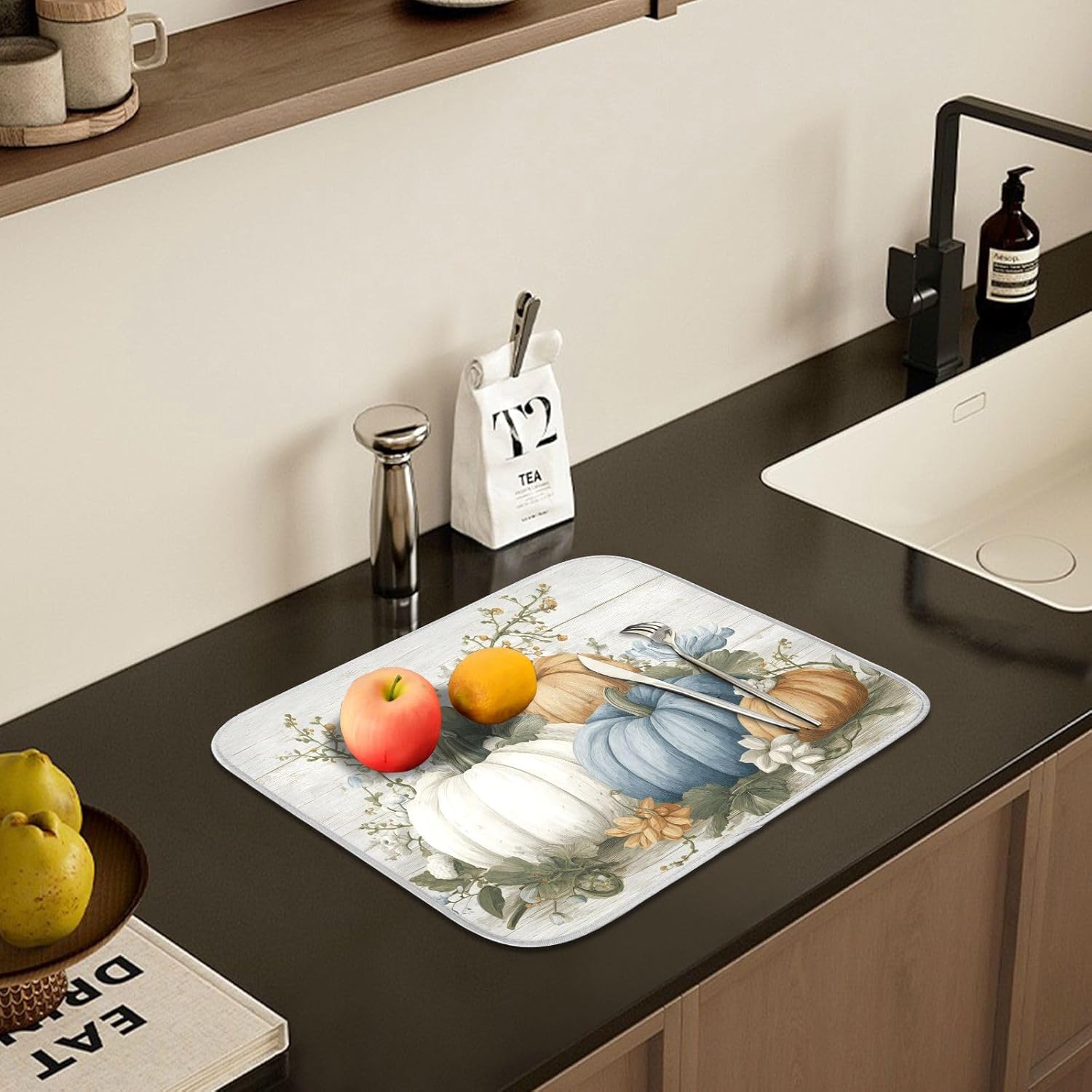 Fall Blue Orange Grey Pumpkin Thanksgiving Dish Drying Mat for Kitchen Counter Absorbent Microfiber Large Drying Pad Dish mats for Kitchen Countertops 18 x 24 Inch