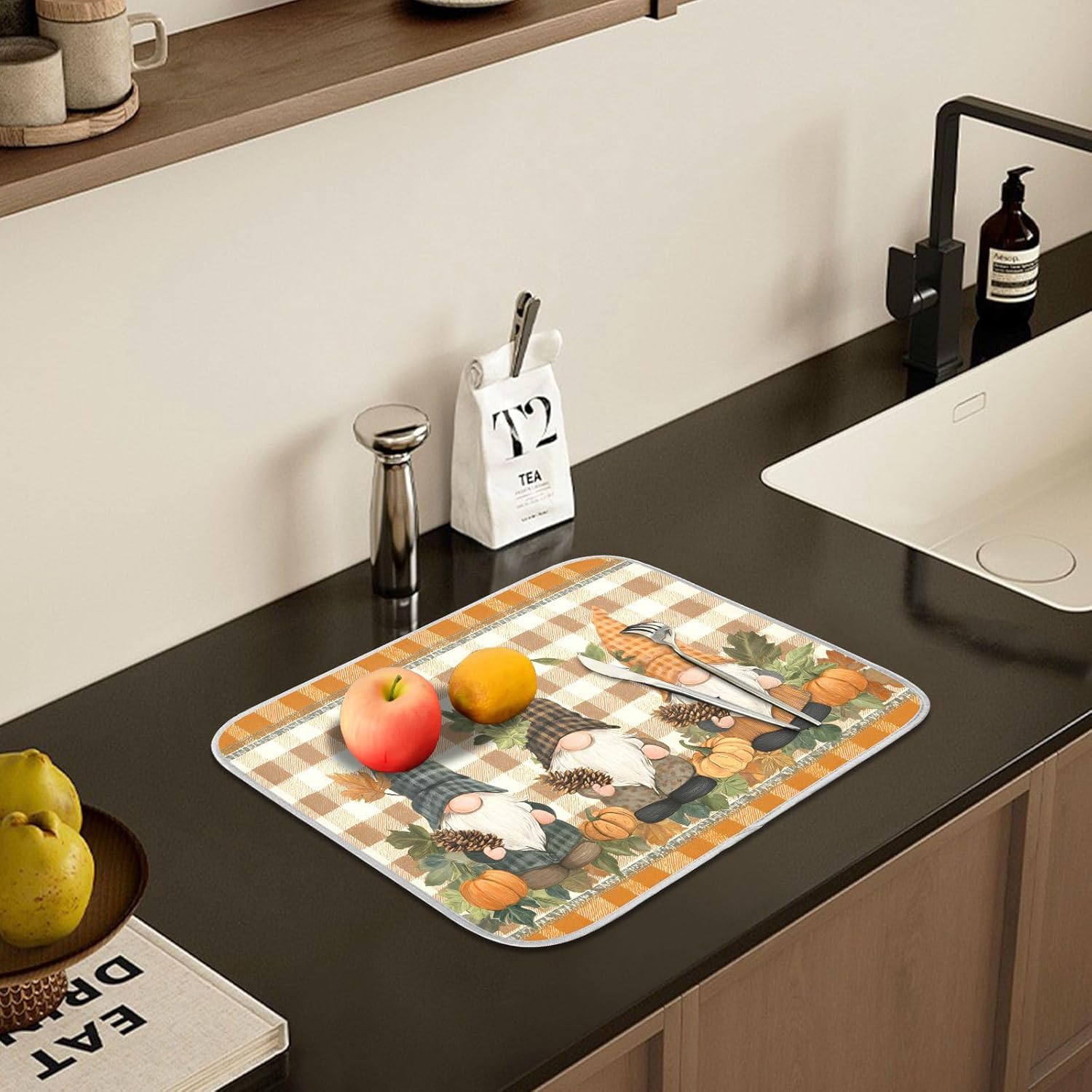 Fall Pumpkin Gnomes Maple Leaves Autumn2 Dish Drying Mat for Kitchen Counter Absorbent Microfiber Large Drying Pad Dish mats for Kitchen Countertops 18 x 24 Inch