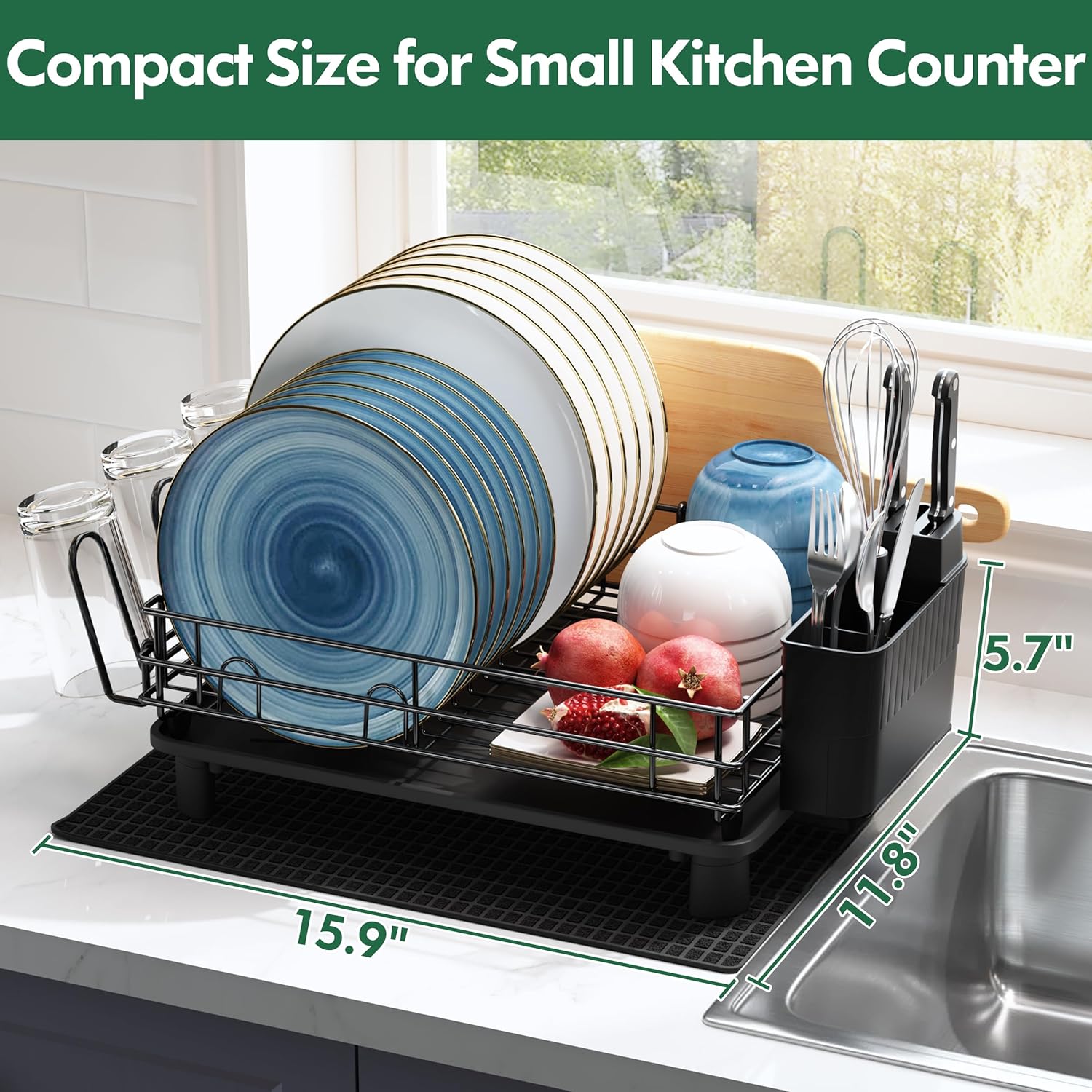 - 📐Compact Dish Rack for Small Kitchen Counters: Space saving 15.9"x11.8" design fits narrow spaces effortlessly. Holds dish drying rack capacity without clutter