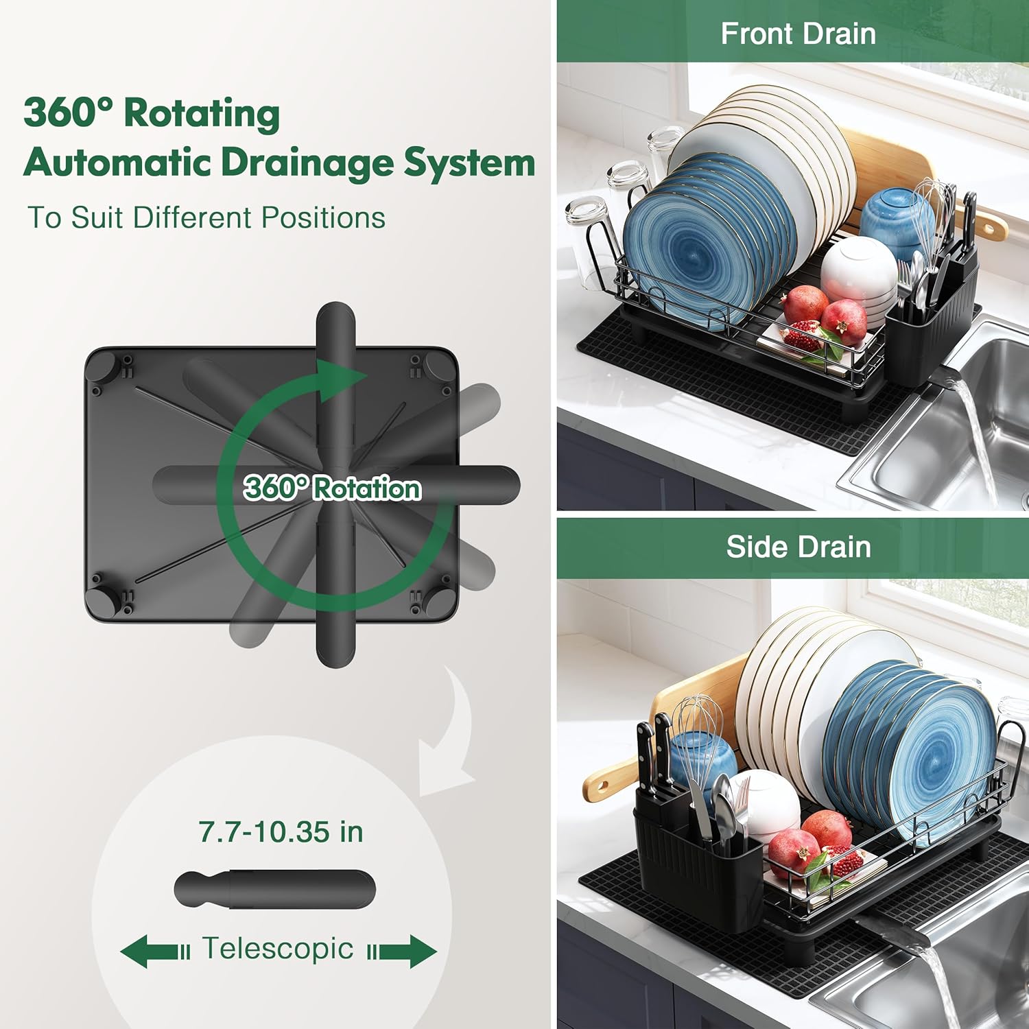 - 💧Efficient Drain: Includes dish rack with drain tray, guided channels and extended and rotated spout route water smoothly to sink to prevent leftover drips on counter