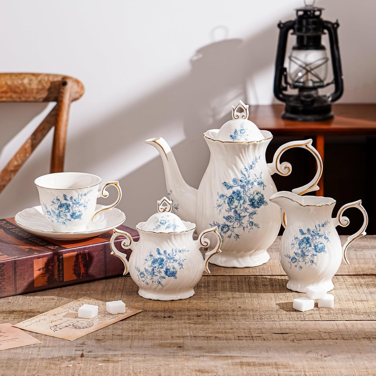 - The minimalist ripple pattern design: Water ripples across the teapot body adorned with blue florals, evoking a springtime ambiance. The elegantly simple blue floral motif seamlessly complements any kitchen or party setting. Please note: The reverse side of the sugar bowl and creamer set features no floral decoration.