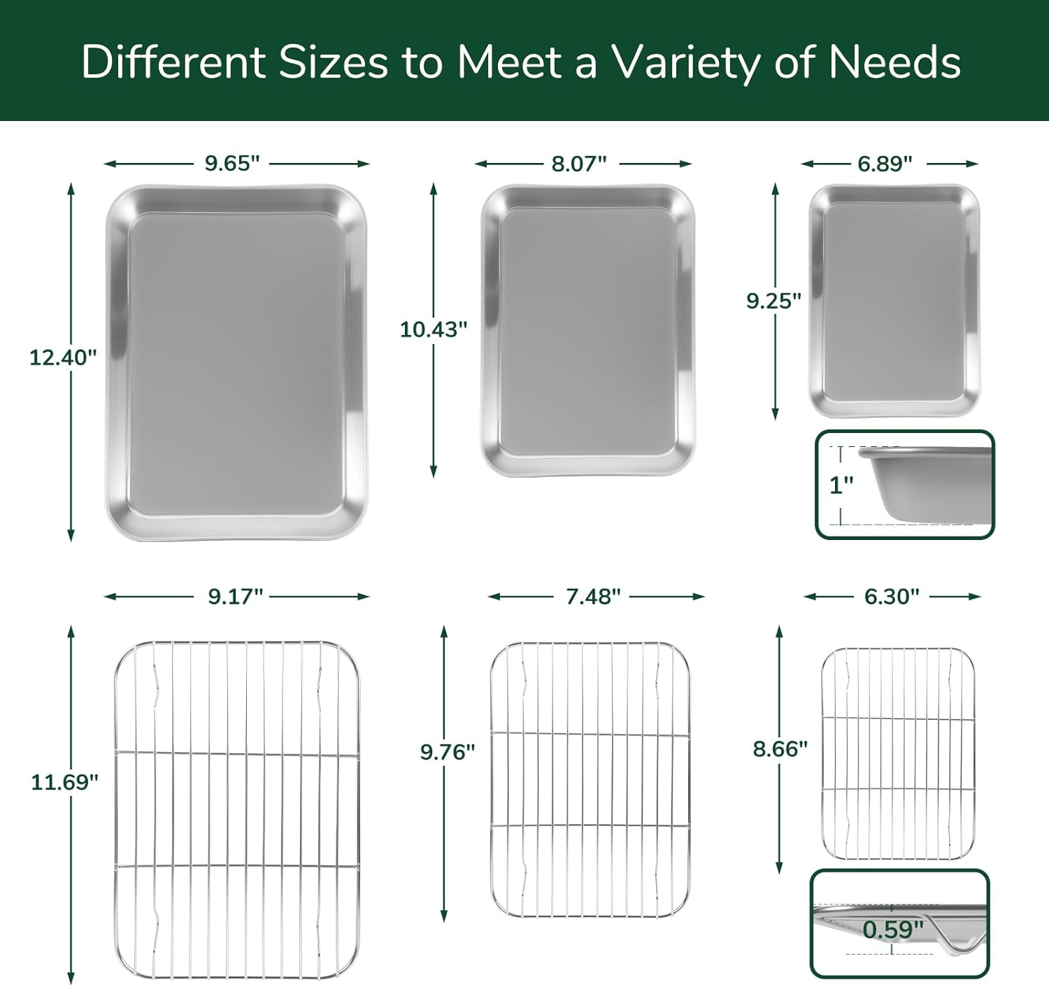 - ๐๐ผ๐บ๐ฝ๐น๐ฒ๐๐ฒ ๐๐ฎ๐ธ๐ถ๐ป๐ด ๐ฆ๐ผ๐น๐๐๐ถ๐ผ๐ป ๐ Bofolai baking sheet Set includes three baking sheets (9.25โ x 6.89โ, 10.43โ x 8.07โ, 12.4โ x 9.67โ) plus three perfectly matched cooling racks, covering all your baking, roasting, and cooling needs.