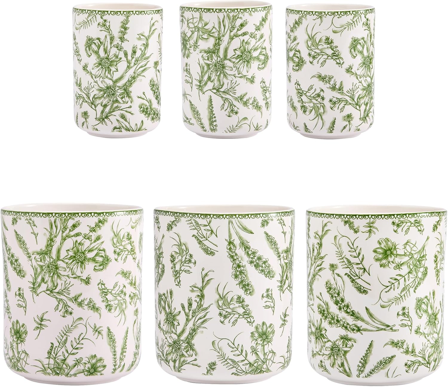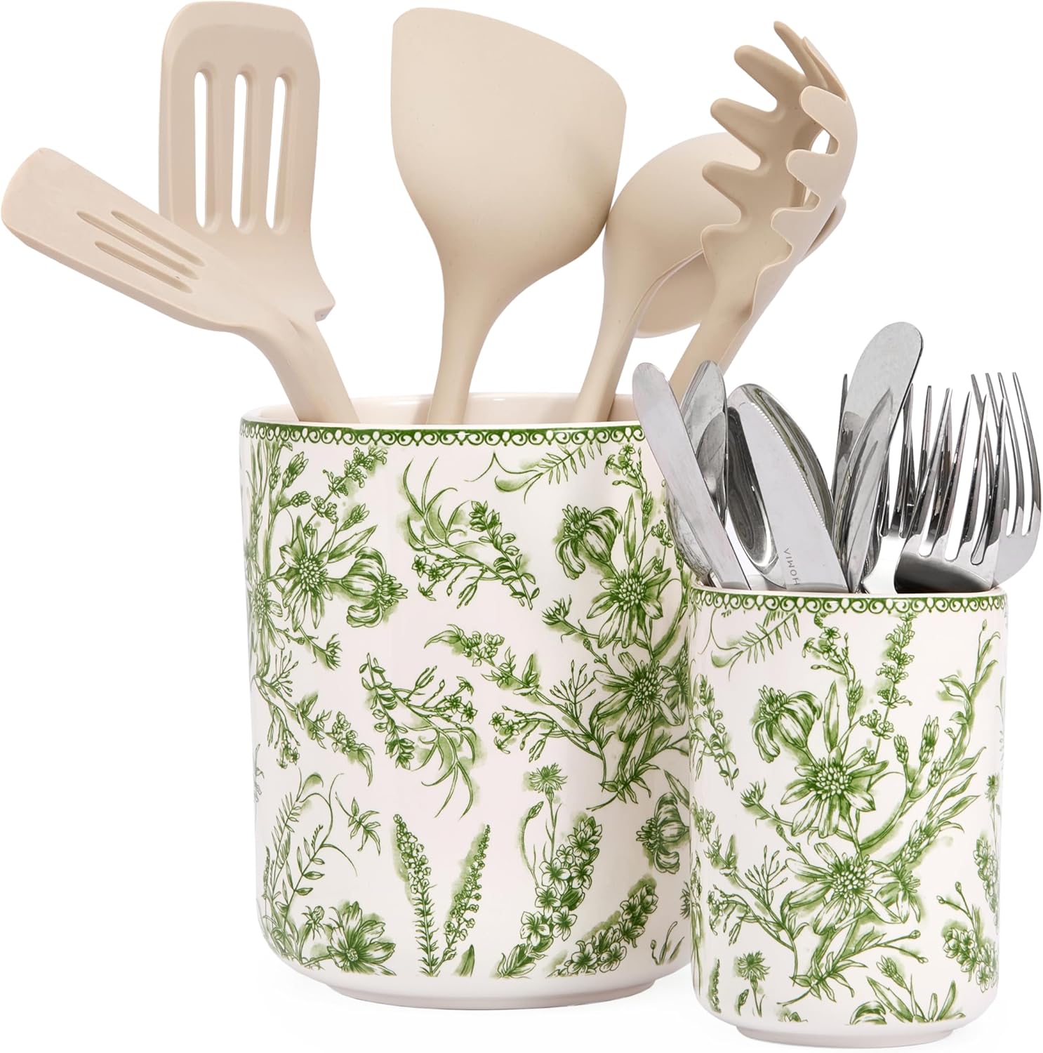 Bico Green Garden Toile De Jouy Ceramic Utensil Holder Set of 2, Ceramic Kitchen Utensil Crocks for Countertop, Large Cooking Tool Holder Counter Decor, Spatula Organizer