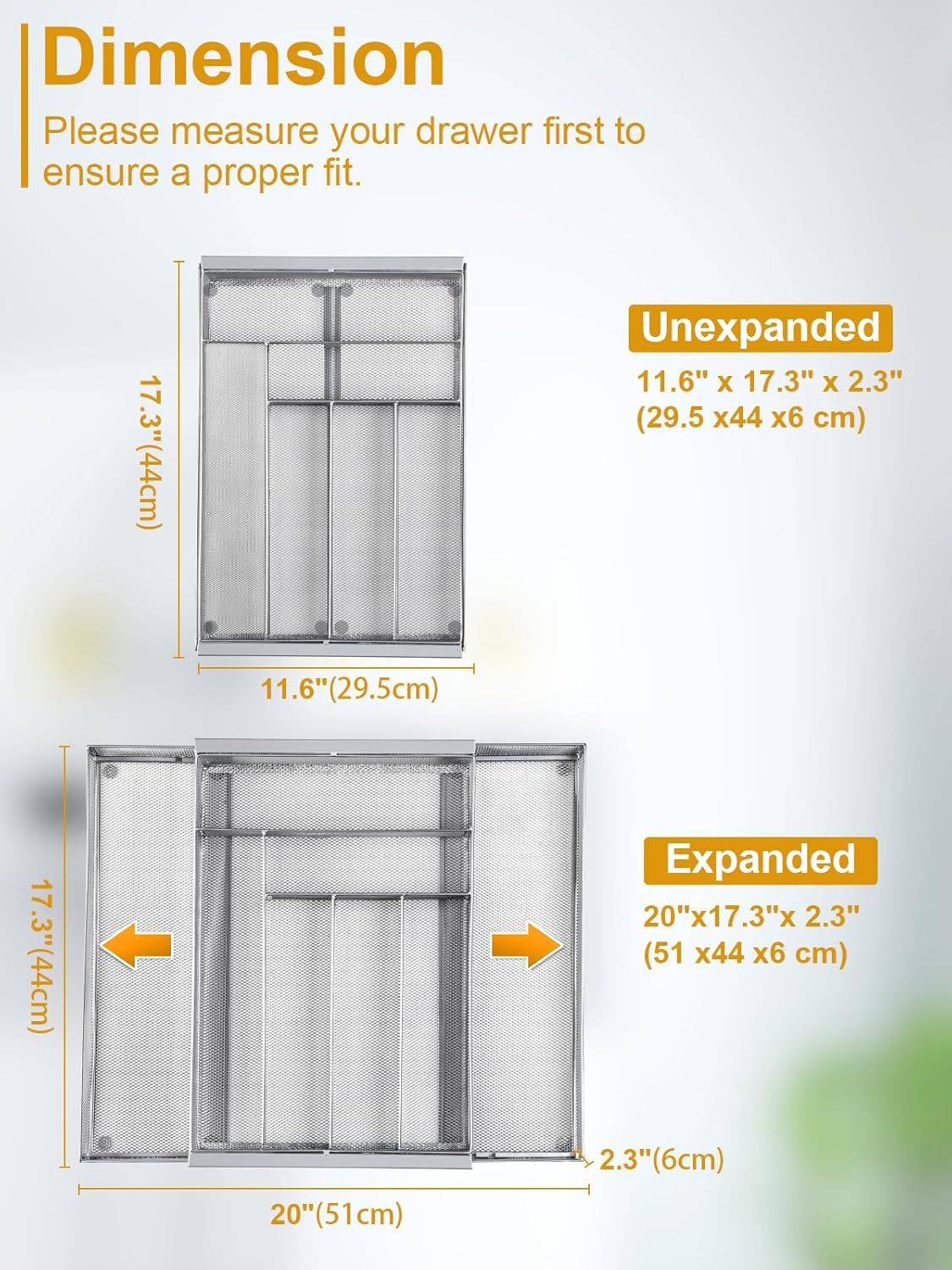 - Stay Organized:This Metal Silverware Organizer Features 7 Deep Compartments That Allow You to See Everything at a Glance—No More Clutter! The Space-Saving Design Helps You Find What You Need Quickly, Whether It's Your Favorite Knife or Spoon. Measure Your Drawer First! Minimum Drawer Size Need 11.7"*17.4”.