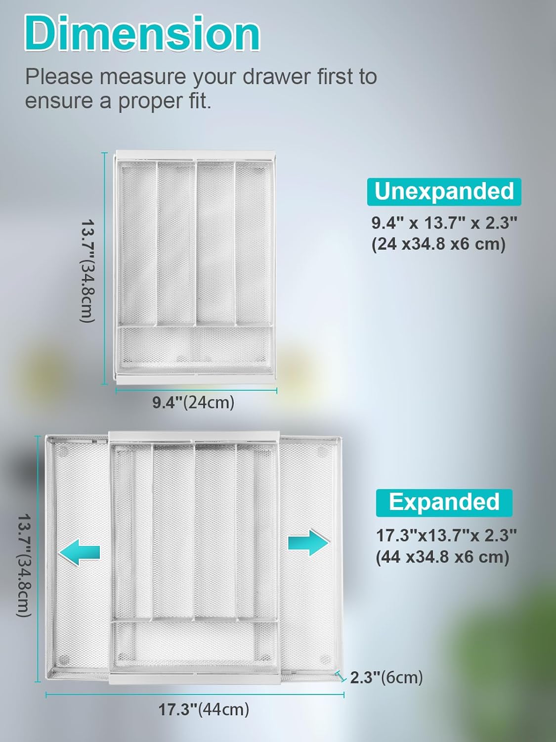 - Stay Organized:This Metal Silverware Organizer Features 7 Deep Compartments That Allow You to See Everything at a Glance—No More Clutter! The Space-Saving Design Helps You Find What You Need Quickly, Whether It's Your Favorite Knife or Spoon. Measure Your Drawer First! Minimum Drawer Size Need 9.5“*13.8”