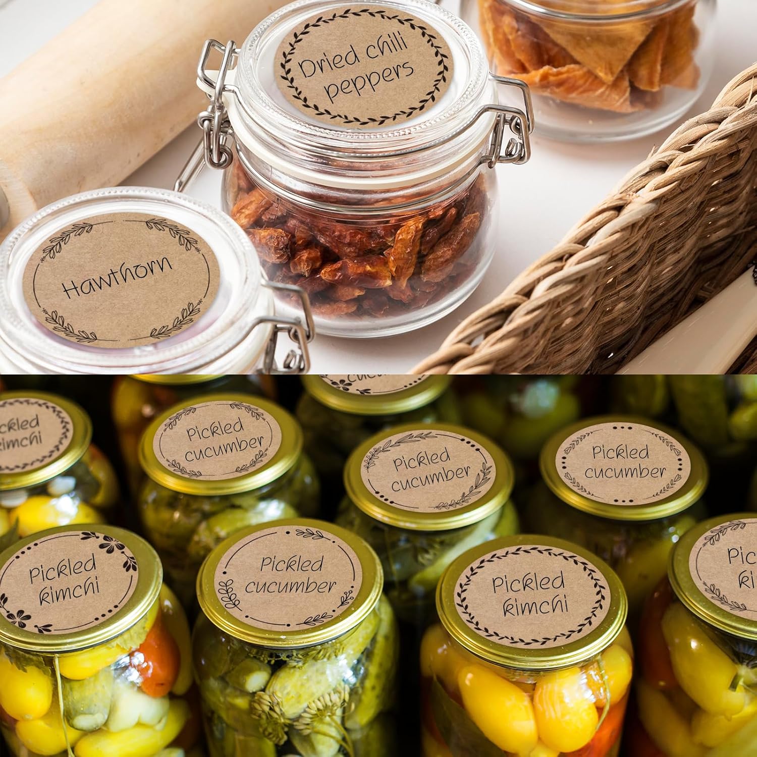 2" Brown Label Stickers for Jars and Lids, Kraft Sticker Labels for Pantry, Mason Jars, Canning, Bottles, 6 Different Drawn Wreath Designs, Kraft Paper/ 500pcs
