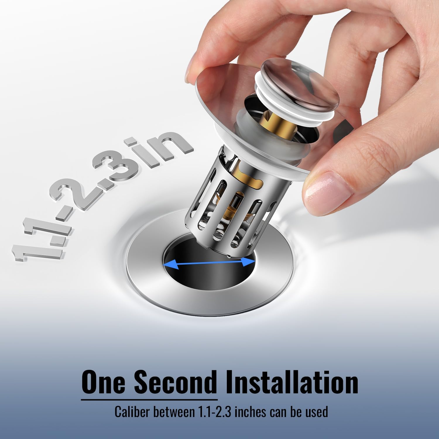 - [🛡️ All-Metal & Unbreakable Durability] Built to last a lifetime, the entire sink drain mechanism is crafted from premium stainless steel and a corrosion-resistant solid brass core. Unlike flimsy plastic alternatives, our drain stopper withstands extreme daily use, and the hardened bronze spring switch is tested over 7000+ cycles without failure. The robust construction guarantees a reliable 3-5 year lifespan, far outlasting ordinary drain strainer and rubber components.