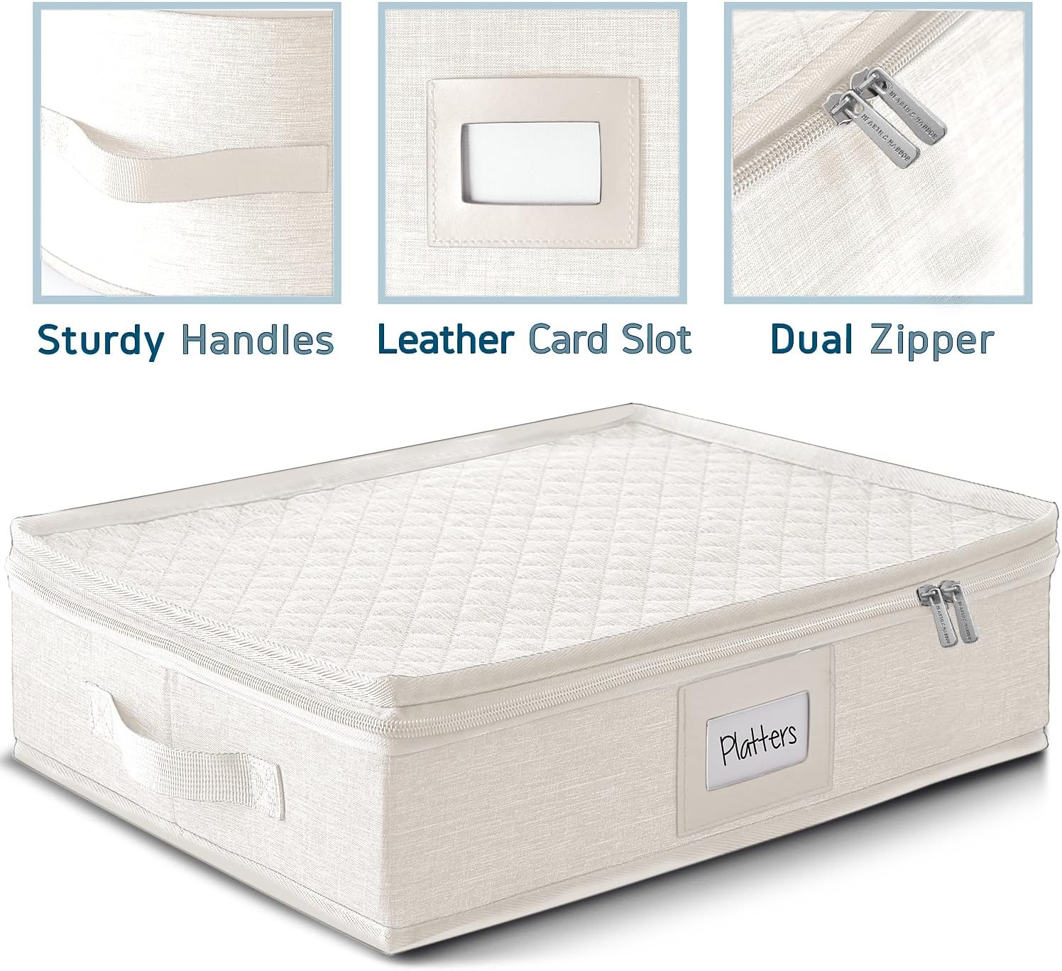 Platter Storage Case – Fine China Storage Containers Hard Shell, Quilted and Stackable 16”x 12.5”x 3.5” Platter Storage Container with Handles and Felt Dividers for Moving and Seasonal Storage, Cream