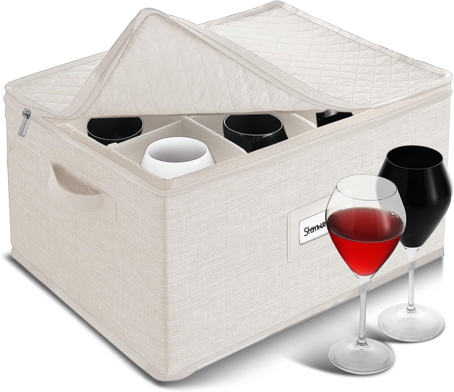 Hearth & Harbor Wine Glass Storage Box with Dividers, Quilted and Stackable Stemware Storage Cases, Service of 12 Glass China Container Hard Shell for Moving and Organization, Cream