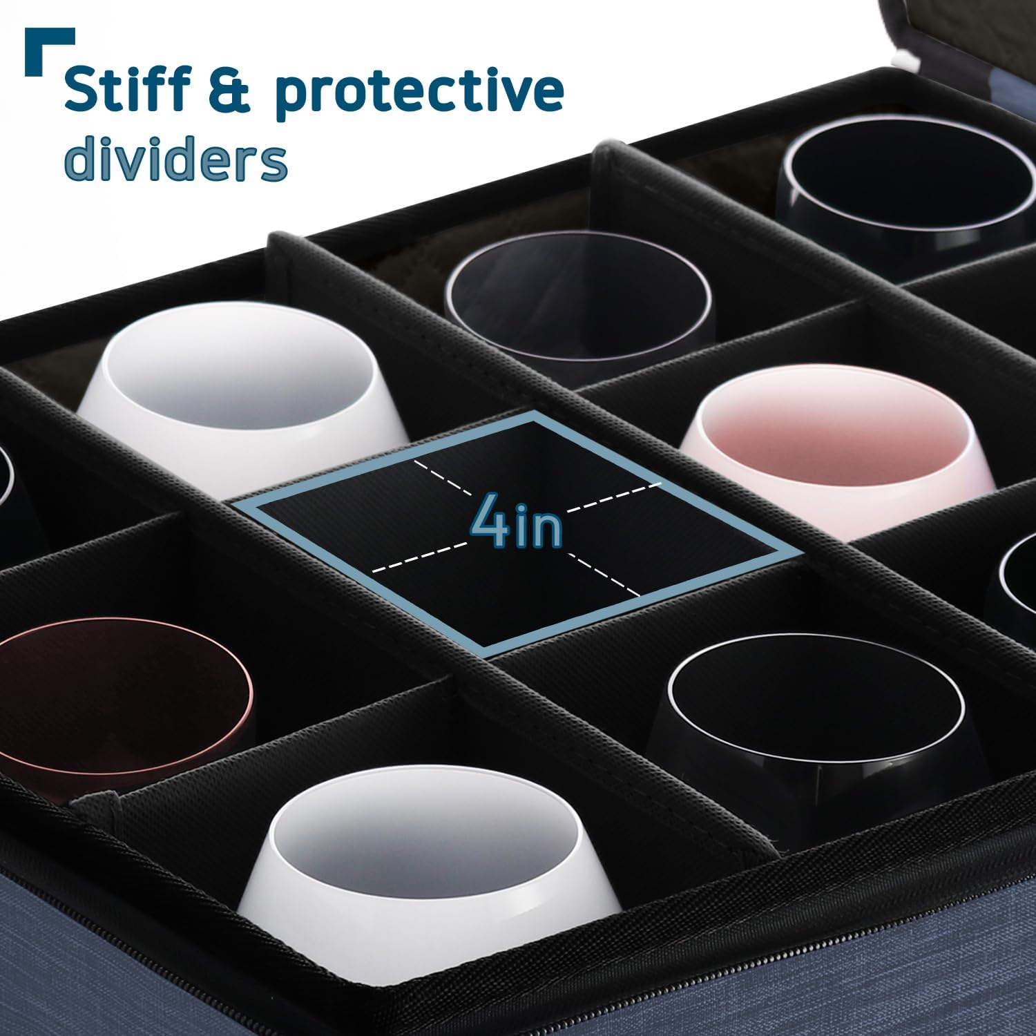 - Fits Up To 12 Cups: This wine glass storage box with dividers fits up to 12 cups in the 4-inch inner slots. Dimensions: 12.5” x 16” x 10”.