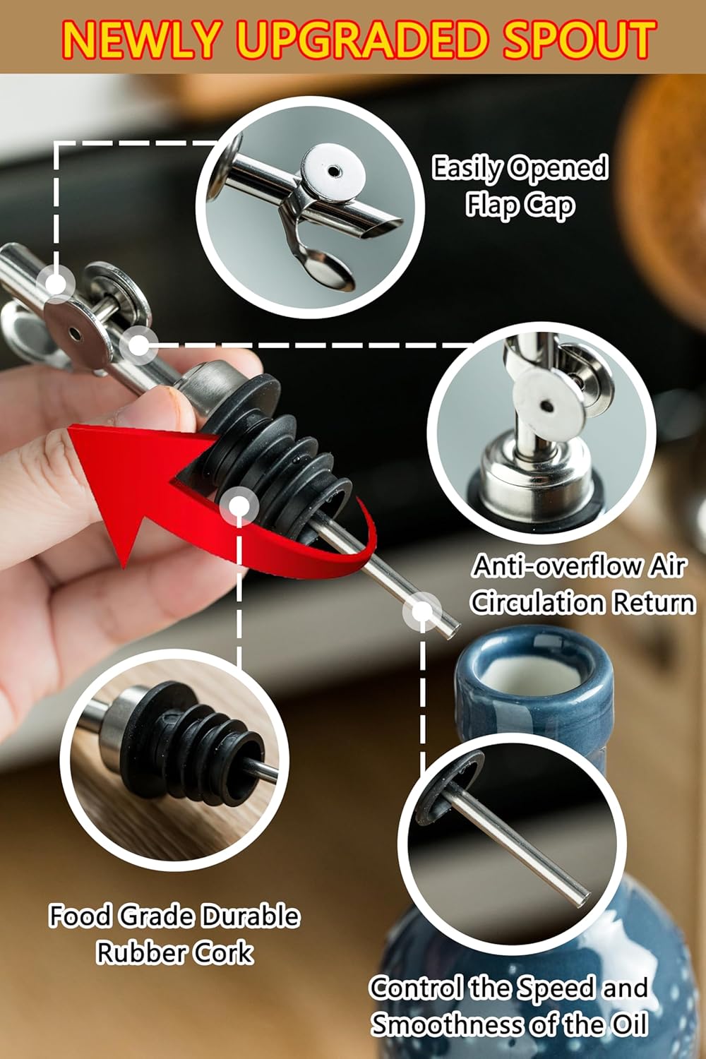 - Upgraded Silicone Spout 2.0: This kitchen oil dispenser addresses the spout popping issue with a reinforced silicone gasket and stopper. Pour cooking oil or olive oil without touching the spout—super easy for kids, seniors, and every family member. It is a reliable olive oil dispenser bottle for daily use