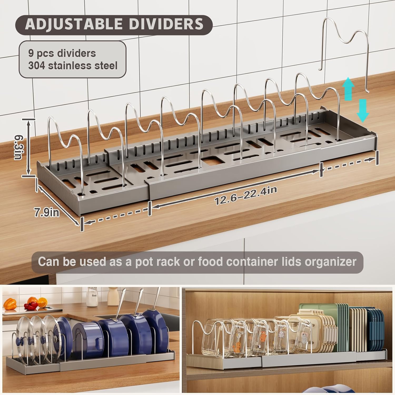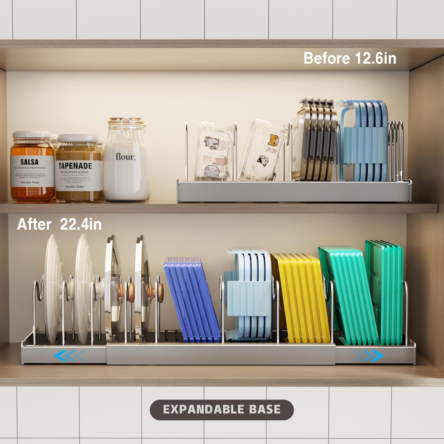 - 【Expandable Design】It measures (12.6"~22.4") L*7.9" W*6.3" H, which can be stretched freely to adapt to different cabinet sizes, suitable for small apartments to large kitchens, large capacity to meet the storage needs of different pots and pans, compatible with a full range of kitchen utensils from frying pans to soup pots.