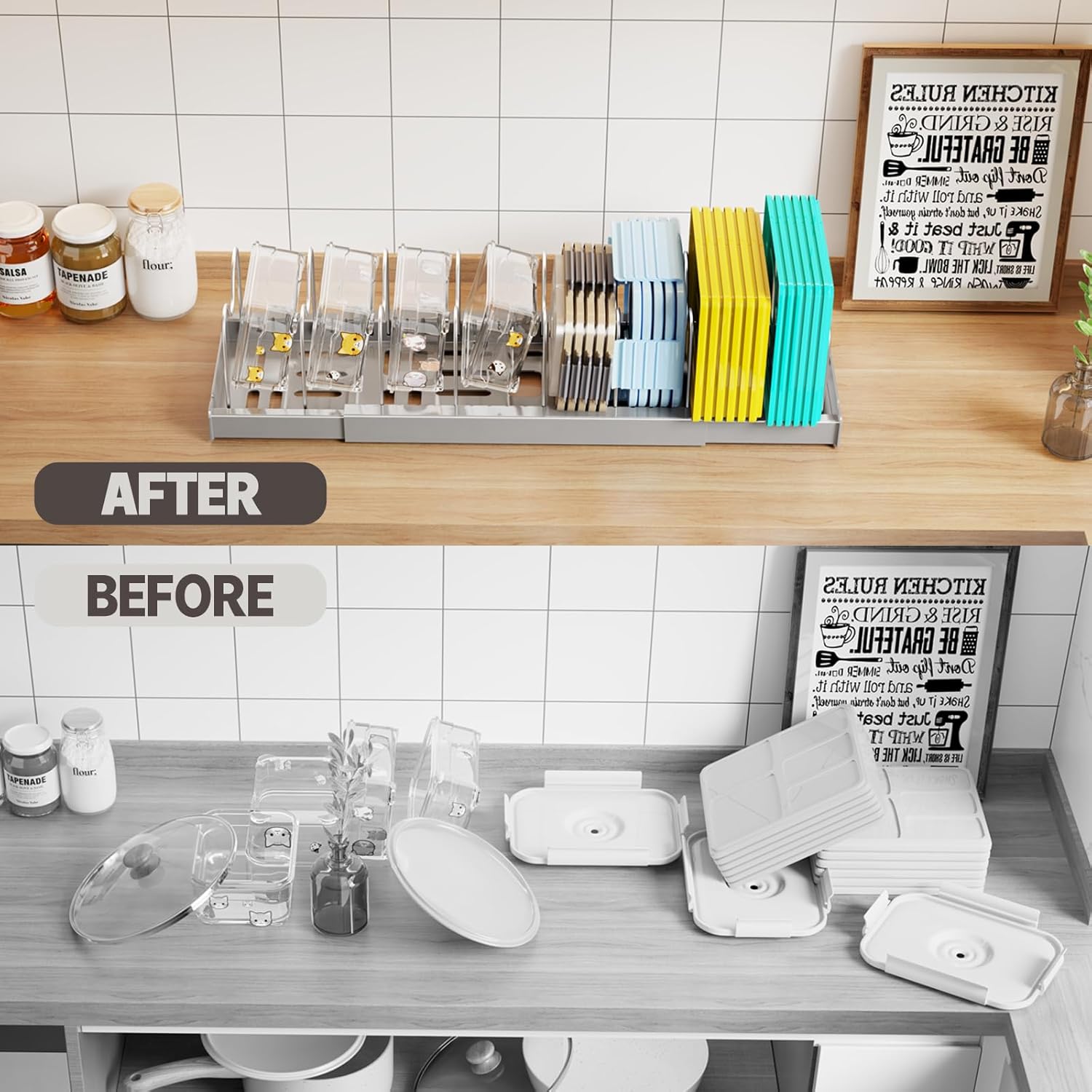 - 【Dual-purpose Lid Rack】This rack can be used to store the lids of pots, pans, and utensils, as well as the lids of food storage boxes. Whether it is placed in the kitchen cabinet or on the countertop, it will give you a clean and tidy kitchen environment.