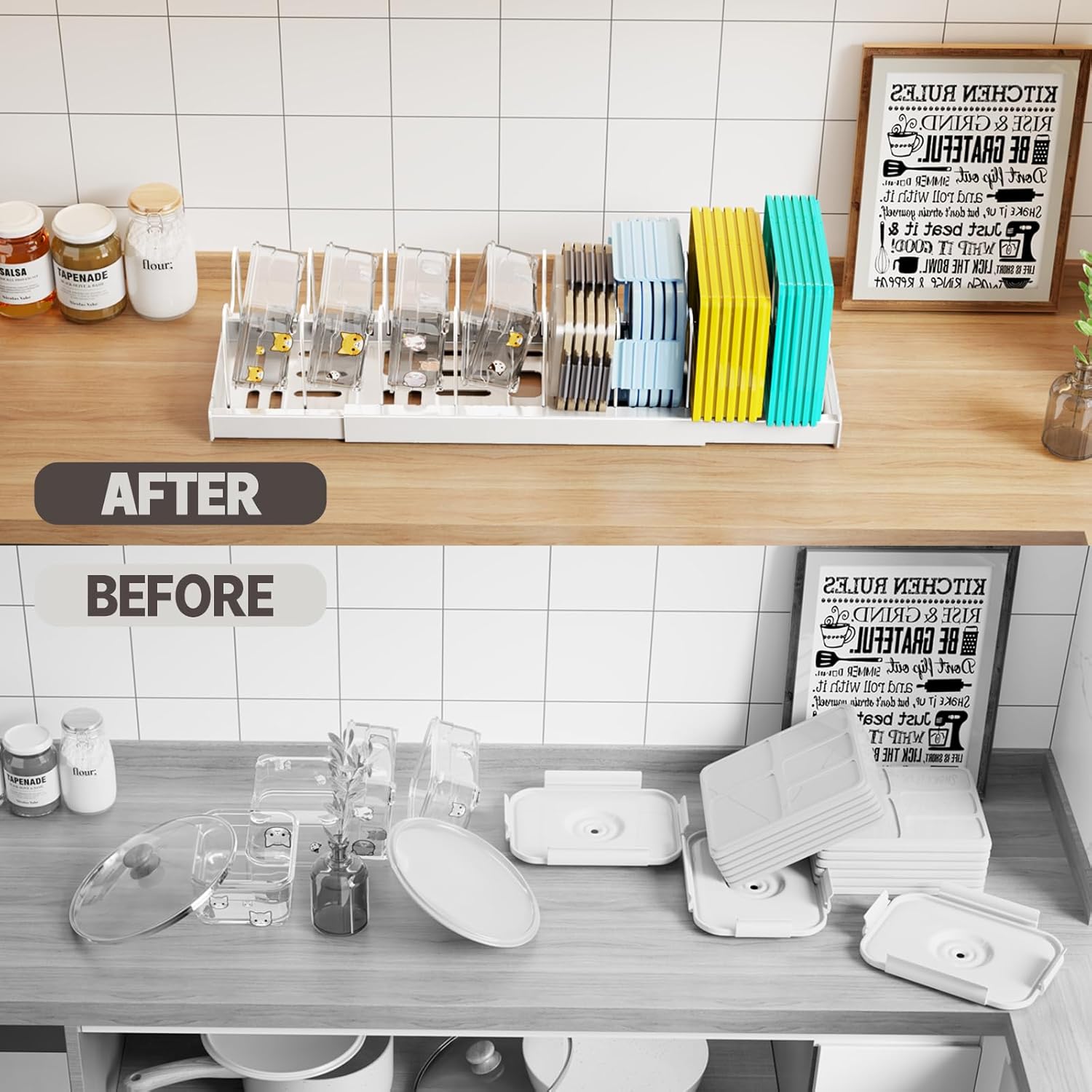 - 【Dual-purpose Lid Rack】This rack can be used to store the lids of pots, pans, and utensils, as well as the lids of food storage boxes. Whether it is placed in the kitchen cabinet or on the countertop, it will give you a clean and tidy kitchen environment.