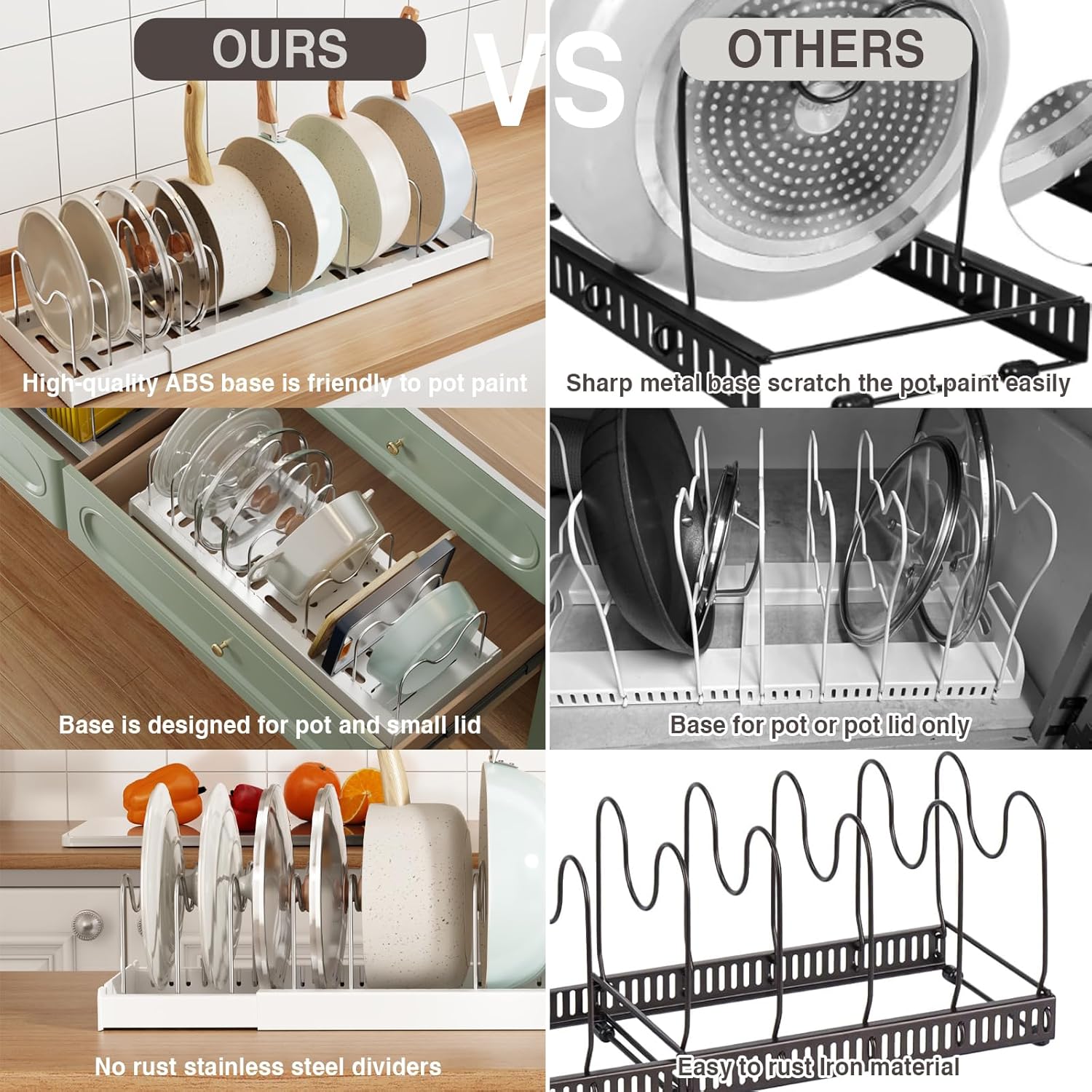 - 【Upgrade Base】The base is made of one-piece ABS material, which is sturdy and durable, with a smooth surface without burrs, protecting the non-stick coating. Compared with metal pot racks on the market, it is more friendly to pot paint and avoids metal scratches.