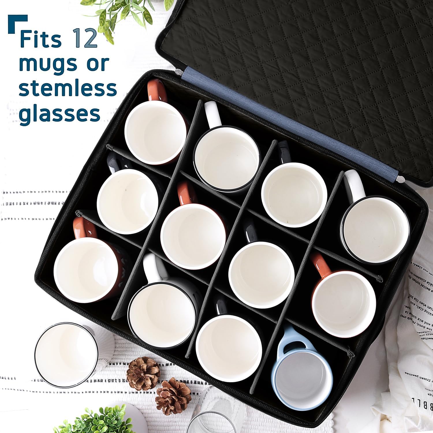 - Dish Organizer Set of 5: This set includes 4 dinnerware storage boxes, for 7”, 8.5”, 10” & 12” plates; and 1 coffee mug storage box with dividers that fits up to 12 cups in the 4-inch inner slots, and measures 12.5” x 16” x 5”.
