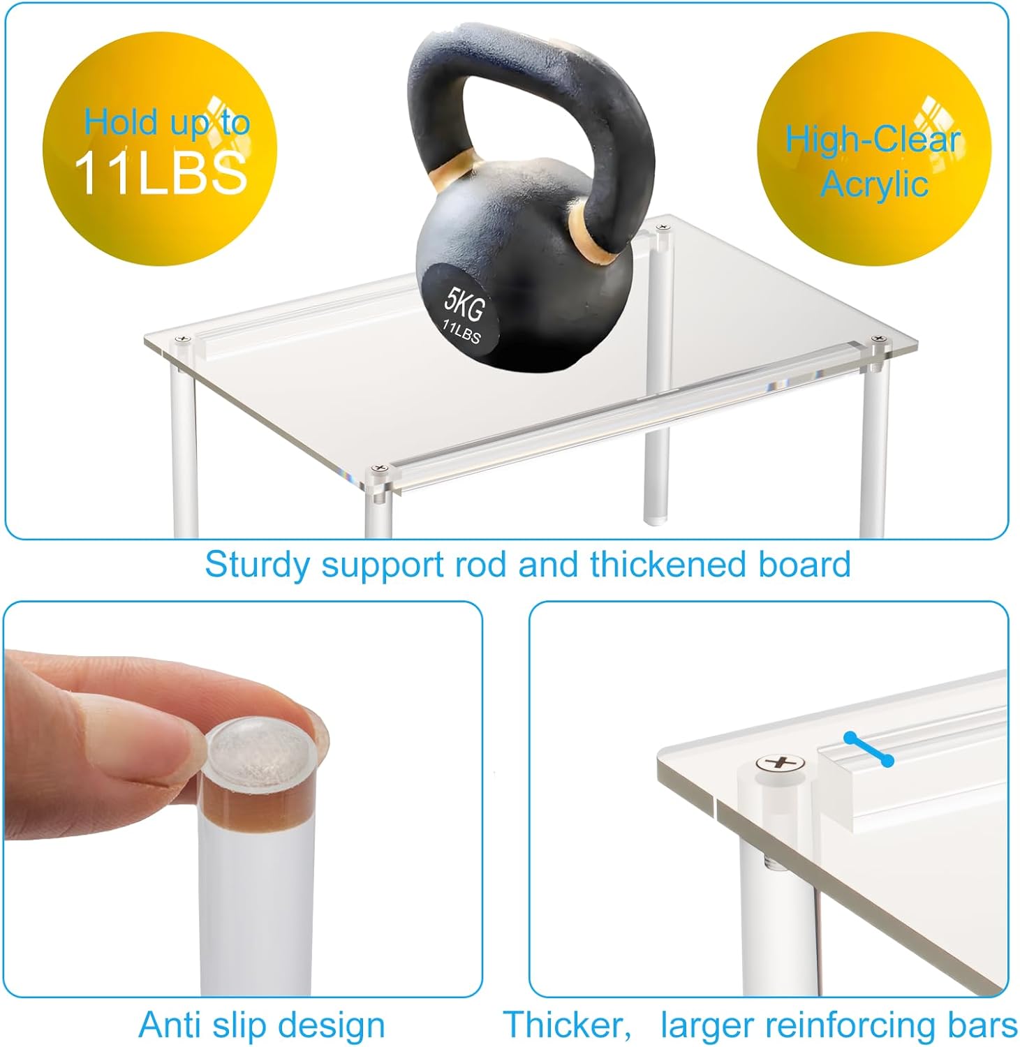 - Sturdy and Durable: Made of high-quality engineered acrylic, spice rack organizer can hold a maximum weight of 11 lb, so you can store loads of supplies on them. The thickness of 4mm sturdy support can well hold glass bottles and bowls safely. Equipped with non-slip adhesive dots for anti-slip and stability