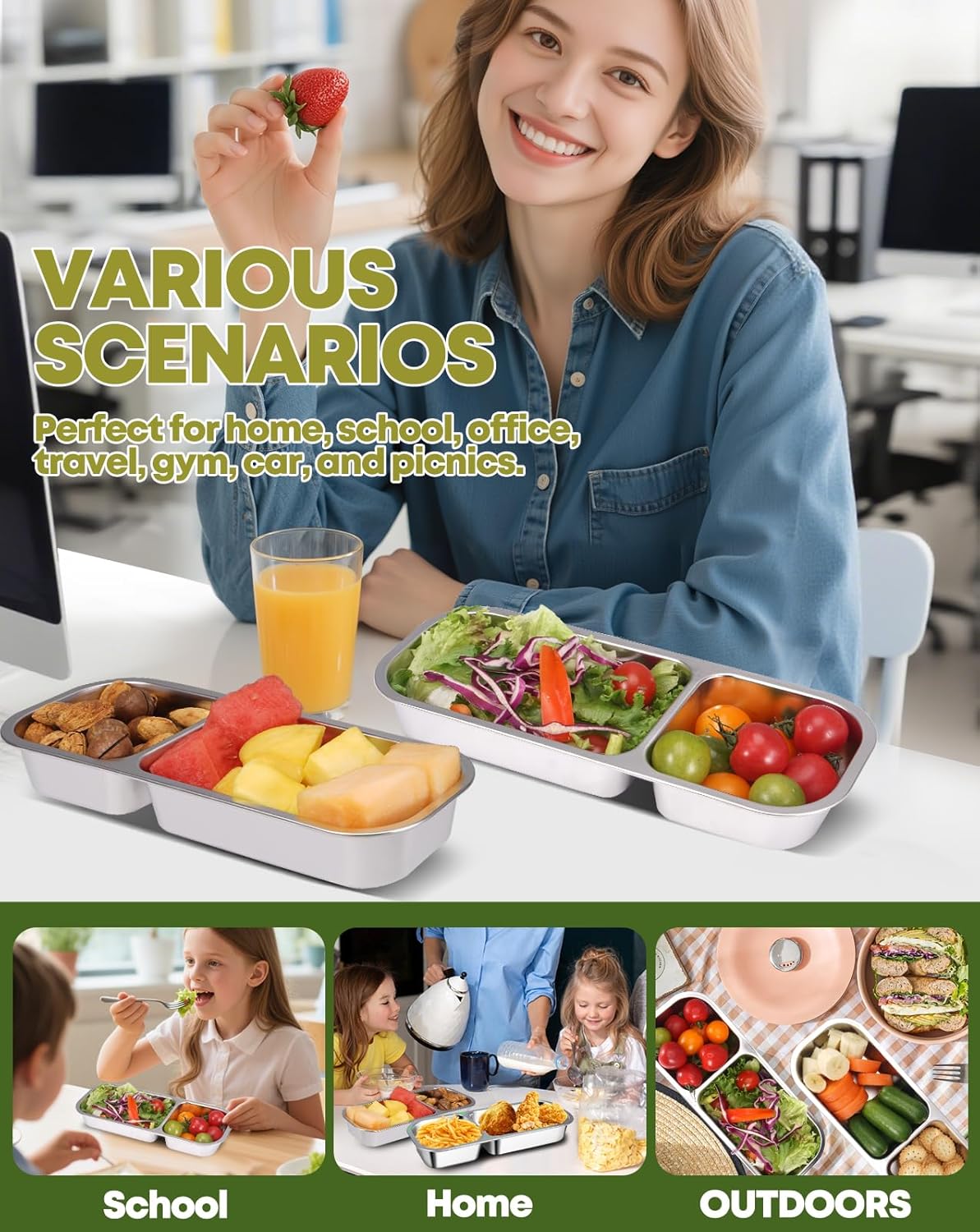 2Pack Stainless Steel Snack Containers for Kids Adults, Reusable 2 Compartment Snackle Box Container with Leakproof Lids Metal Bento Lunch Boxs Food Storage Containers for Travel Picnics Office School