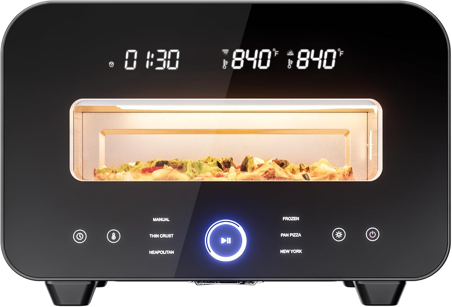 - 【6 Smart Presets】High-heat retention design + double-glazed window sustains 840°F cavity temperature for sequential baking. Touchscreen presets include: Thin-Crust, Pan, Frozen, Neapolitan, New York, Detroit-style.